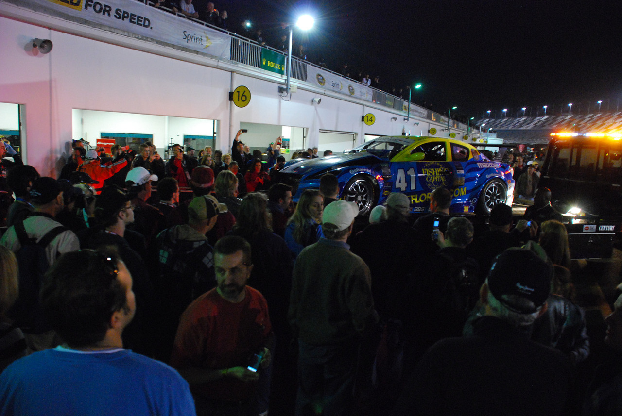 During the night, several cars ended up in the garage for various issues, including one of the two Dempsey Racing Mazdas due to a wreck shortly after 9:00pm. We’d been in the garage area an hour or so earlier, and there weren’t many fans there, but once a Dempsey car was brought in, it seemed like every fan left at the track headed to get a look, as shown in one of the shots below that was taken as they were bringing it in on the flatbed. We also walked the backside of the pits a few times at night, as it’s pretty cool to watch the crews at work. In the shot below taken from behind the fence, the driver in yellow standing there with his helmet on is Patrick Dempsey, waiting for the #40 RX-8 to pit so he can get out there for his night stint