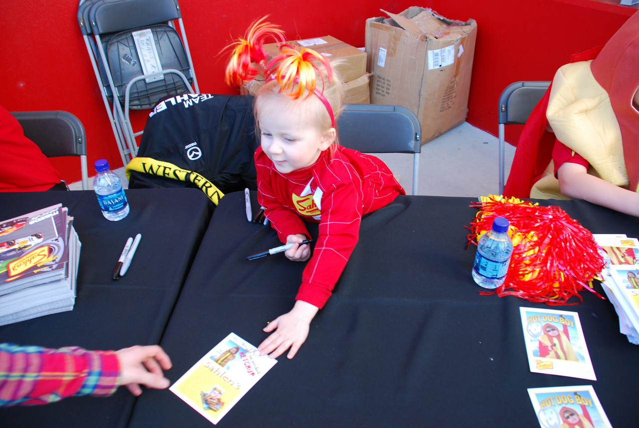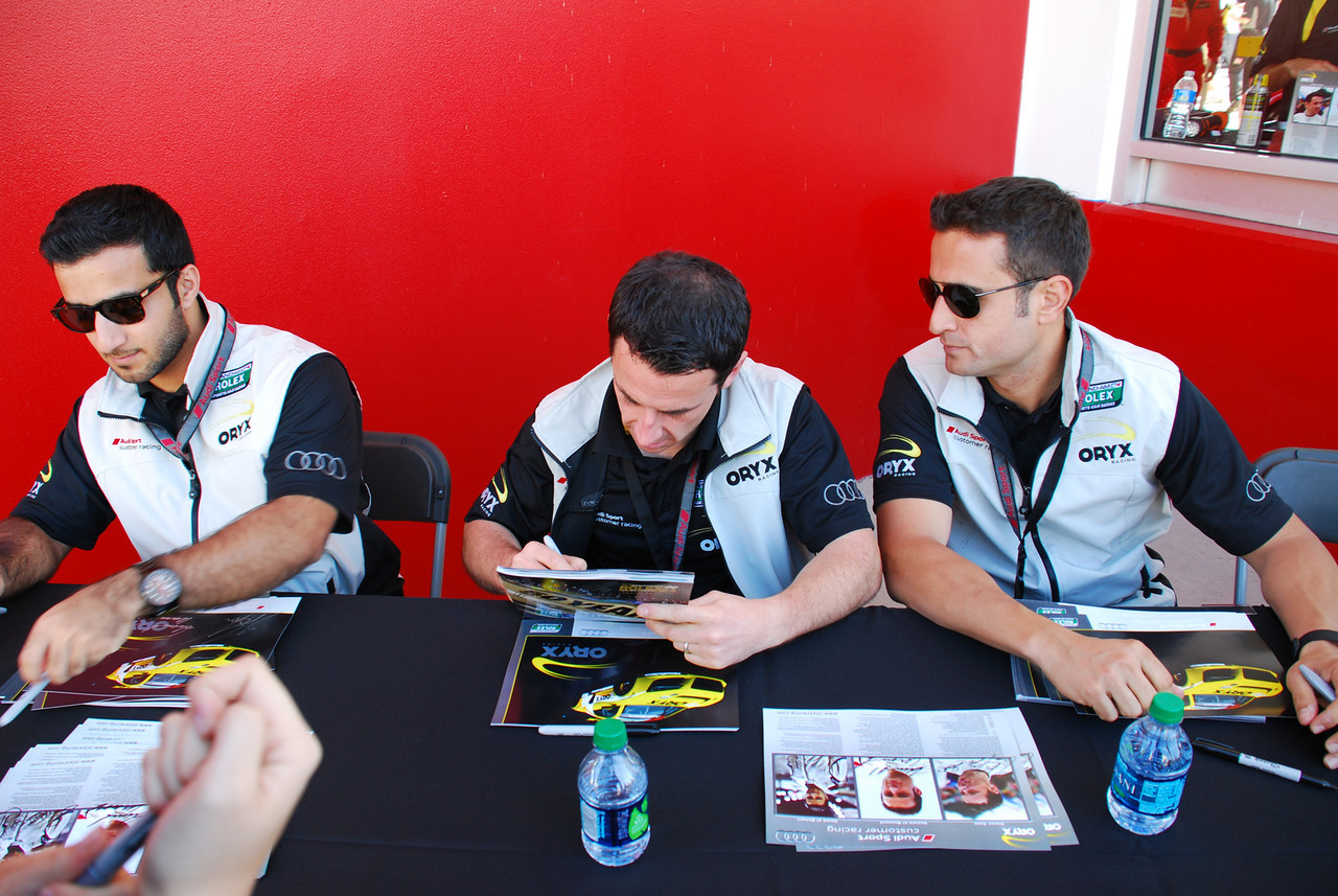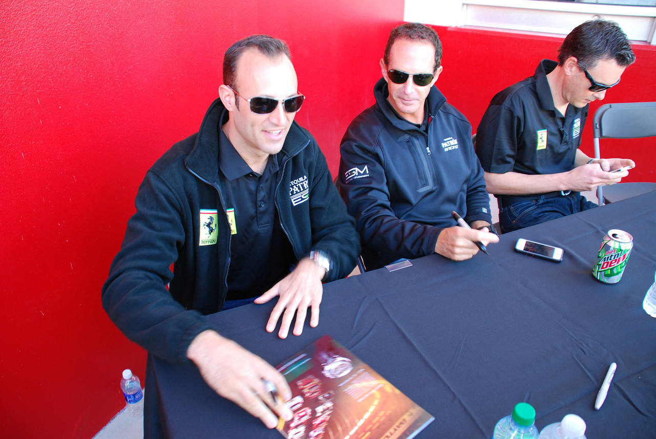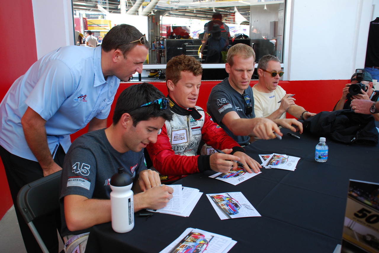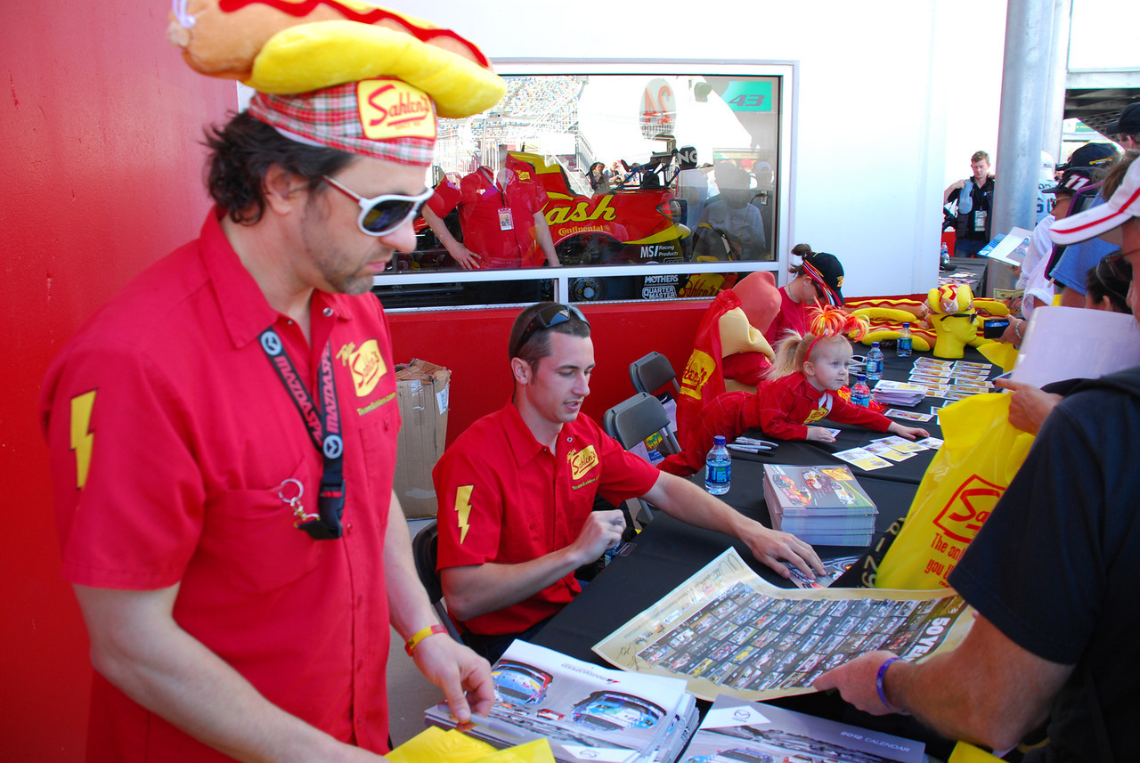 One of the big events we wanted to hit was the autograph session, as we both really enjoy meeting the drivers. Travis Pastrana was co-driving Michael Waltrip’s Ferrari, and with Bayley being a huge fan of his, we waited in that line first. We got over there 45min early and ended up second in line, but by the time things started moving, he had one of the longest lines there, second only to Patrick Dempsey’s, if I recall. Travis was really friendly, and Bayley couldn’t have been happier to get her picture with him. After we finished with his line and the tables that followed, we headed over to where I wanted to be, in Flying Lizard’s line. I’d bought a team flag the day before, but completely forgot to bring it with me to the autograph session. With no time to run back to our car and get it, I just went through and got autographs on the cards they provided. In the session shots below, be sure to check out the ones from the Sahlen’s table (last two pics). That little girl was awesome, sitting there signing autographs like she’d been doing it for years!