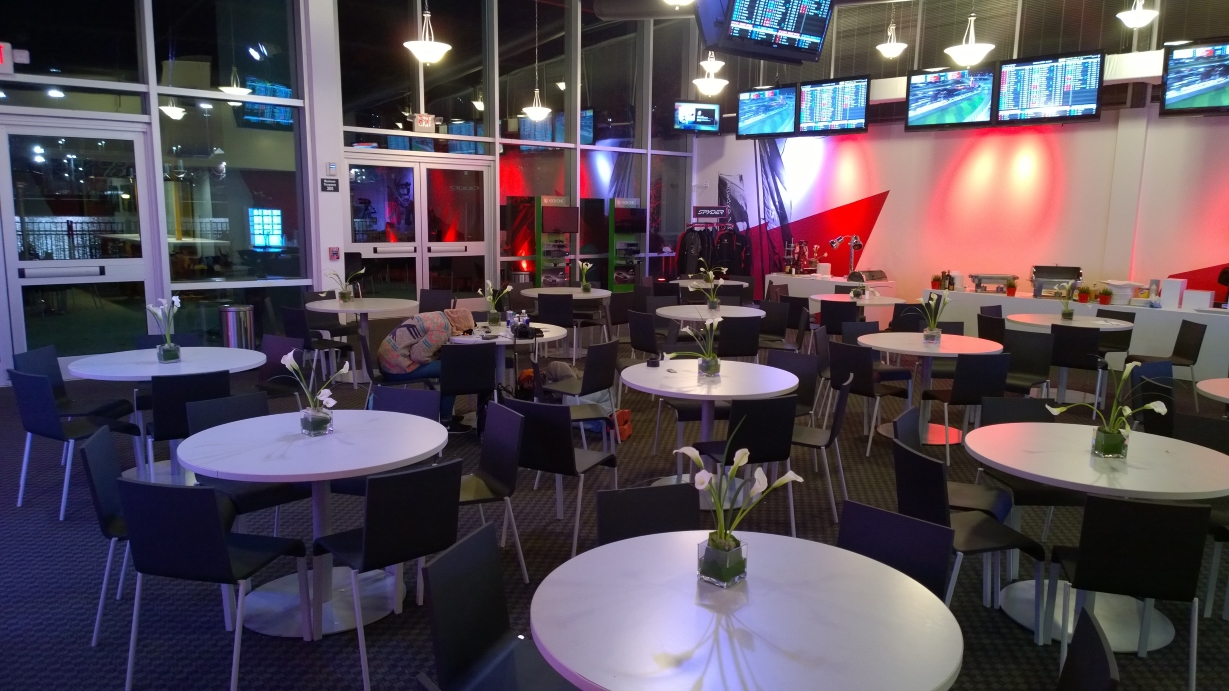 Around 6am, the catering staff began to arrive, and we cleaned up our area a bit so we weren’t in the way. As more people began to show up, the sun started rising over the backstretch. I absolutely love watching the sun come up at the track, and the patio area of the Boardwalk Club was a great place to do so.