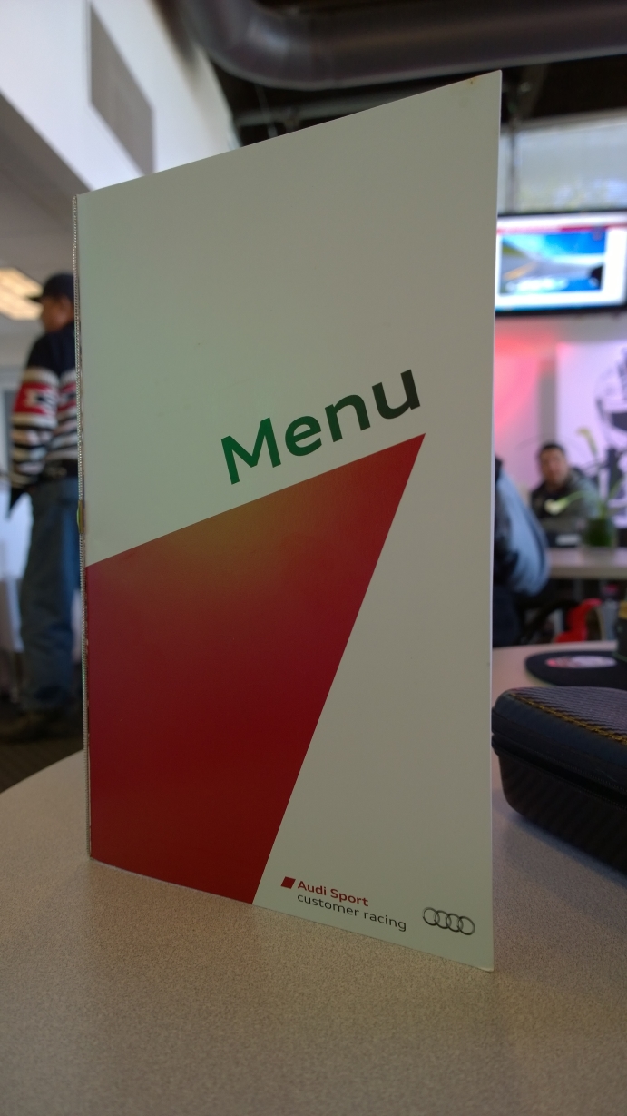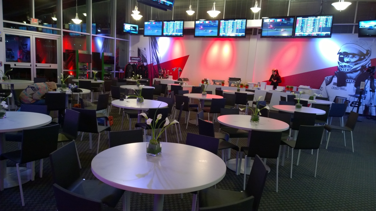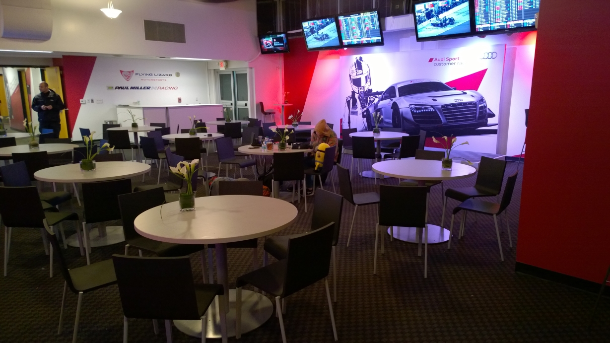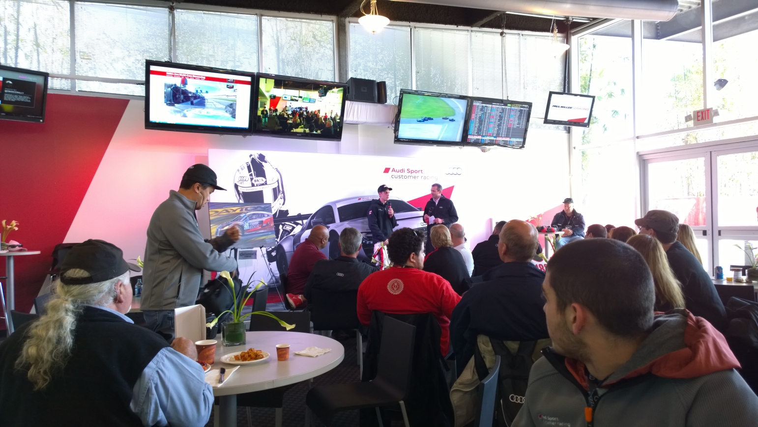 At about 10:45am, after just over an hour and a half hanging out in the suite, we decided to head to the Boardwalk Club for lunch. One of the things we hadn’t taken advantage of yet were the race updates. Audi did these a couple of times Saturday and once or twice Sunday, and it was basically a short update on the status of the Audi teams from one or more of the drivers. For the 11am update today, Dion von Moltke from Paul Miller Racing was there between stints to update us on their race. They’d had a pretty good race up to the 17 hour mark, fighting for the win, but a couple of issues late in the race had them fighting to get back up front. While Dion was in there talking, we could see on the monitors above him that another issue struck the car, as it was spending an extended period of time in the pits. In the shot below where you can see the monitors above him, the one on the left is the live shot out the rear of his car as it was sitting on pit lane.