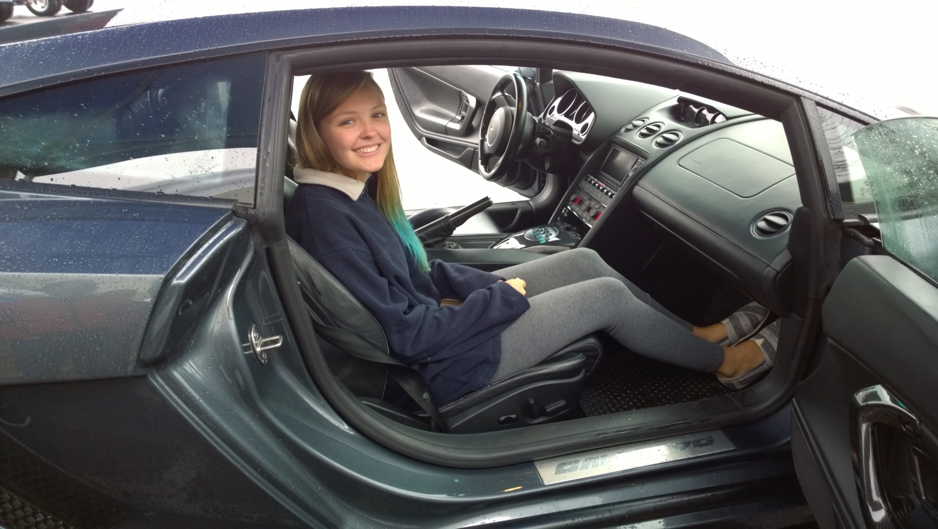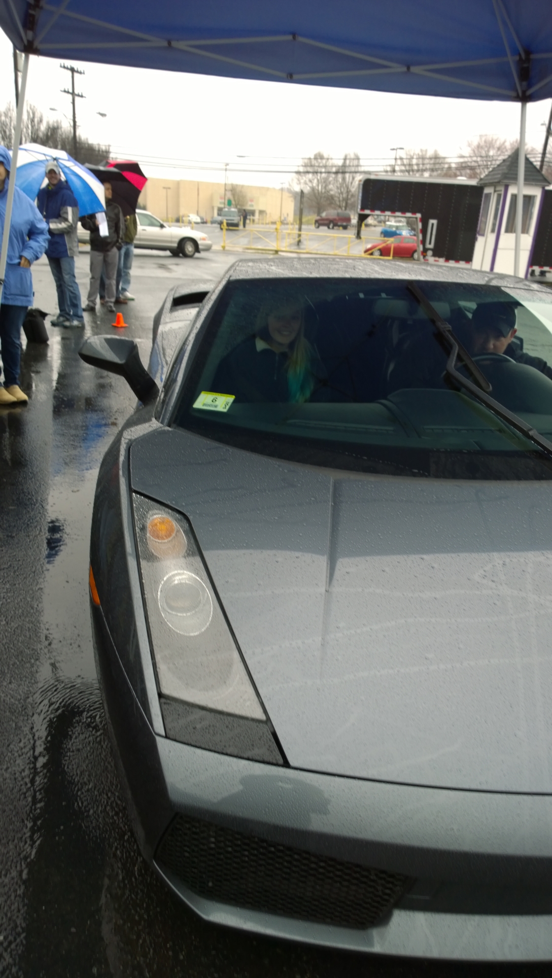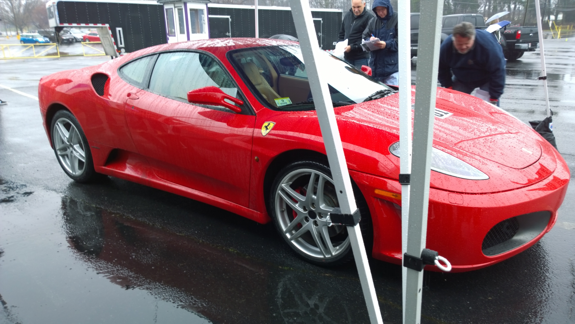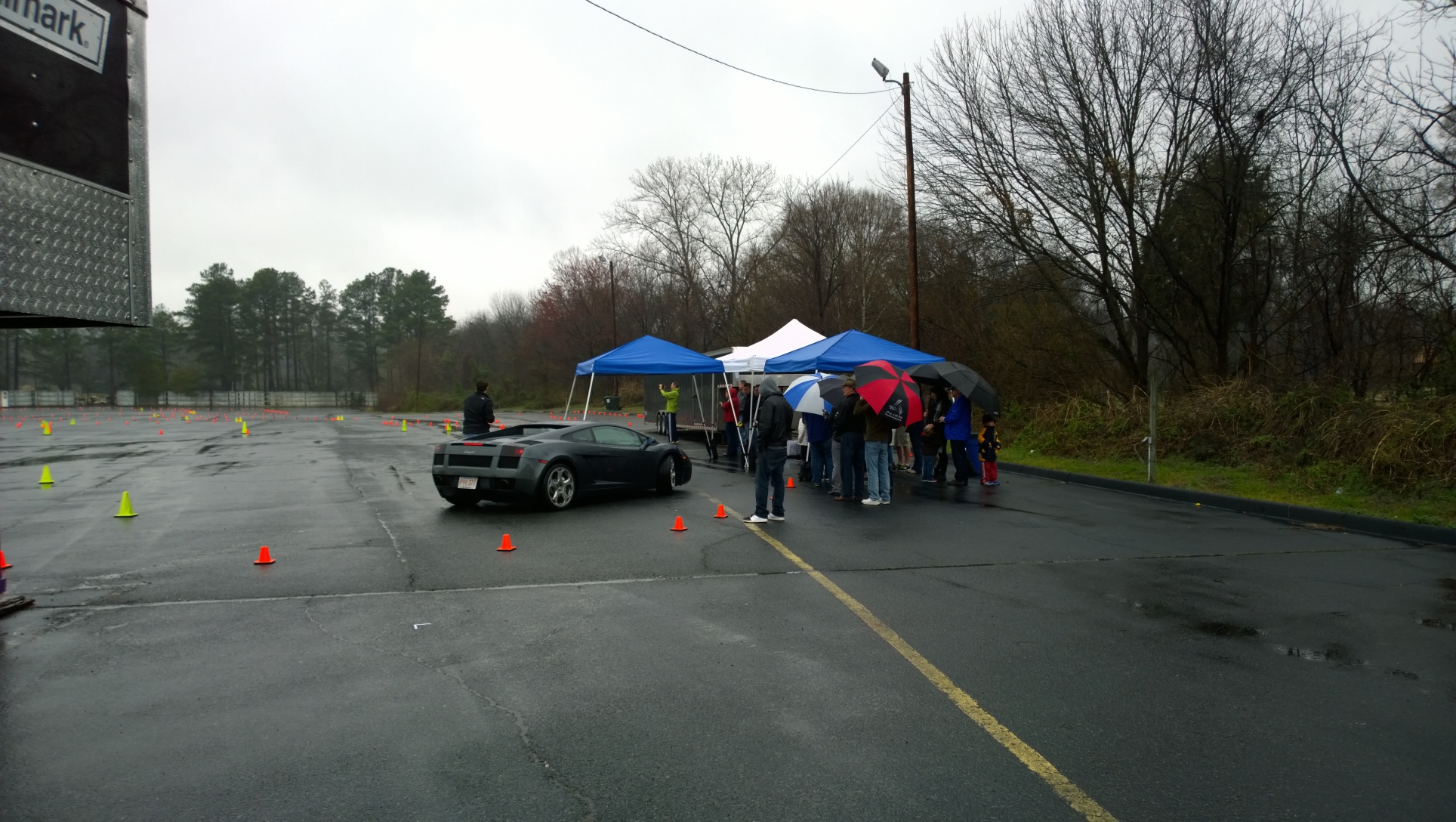 Back to the review: After checking in, we hung out under the canopies they’d put up (due to rain) and waited for the event to start. There weren’t a huge number of people for our 9am session, I’d say 7-8 for each of the two cars at most. Those driving the Ferrari got a nice upgrade at no cost, as the 360 was in the shop, so all they had was the F430 (both the F430 and Gallardo are 2006 models, BTW). They take you out based on the time you checked in, which they’d written on your wristband, so I was 3rd for the Lambo. With the ground being so wet none of us in that first three pushed all that hard, but I really did enjoy it. I’ve driven some fast stuff, but never something so well balanced in the corners. The instructor (or ‘sherpa’, as they call it) who was with me was really good, too. Very nice and talked you through the whole thing, and was far more helpful than the spotter I had with the IndyCar experience. He gave me pointers on corner entry/exit, and when to give it power exiting a turn. It ended faster than i’d have liked, which wasn’t a big surprise. Three laps is a bit short in my opinion, but I knew what I was getting in to, and I’m sure if I’d asked I could have upgraded to six for a little more. It was enough to give me a taste of what a well balanced supercar felt like, so it was worth it to me.