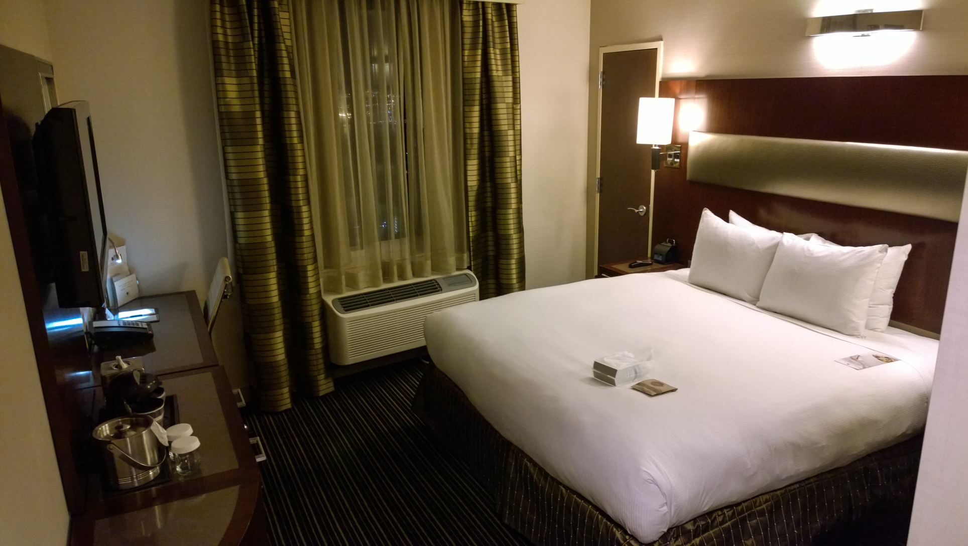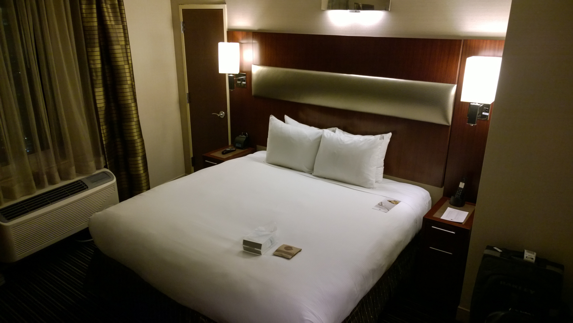 So how did they hold up on this visit? Well, things started out with a small issue, but overall it was good. After landing at LGA, I grabbed a car to the hotel, and upon arriving, was greeted by a friendly gentleman at the front desk who handed me my room keys, the warm cookie, and a bag containing two bottles of water. Check-in took all of 3min thanks to Doubletree allowing you to check-in online ahead of time, including selecting your room (nice touch, BTW). I chose 4310, a king deluxe room with a view of the Hudson river. After getting my keys, I headed up to 43 and tried to enter my room. I tried, really I did. I must have tried both keys a couple dozen times, but no go. Neither worked, so back down to the desk it was with all of my stuff in tow. The clerk apologized, set those same cards up for the room once again, and back up I went. They worked like a champ this time, so that little glitch was resolved. No harm no foul, I guess.