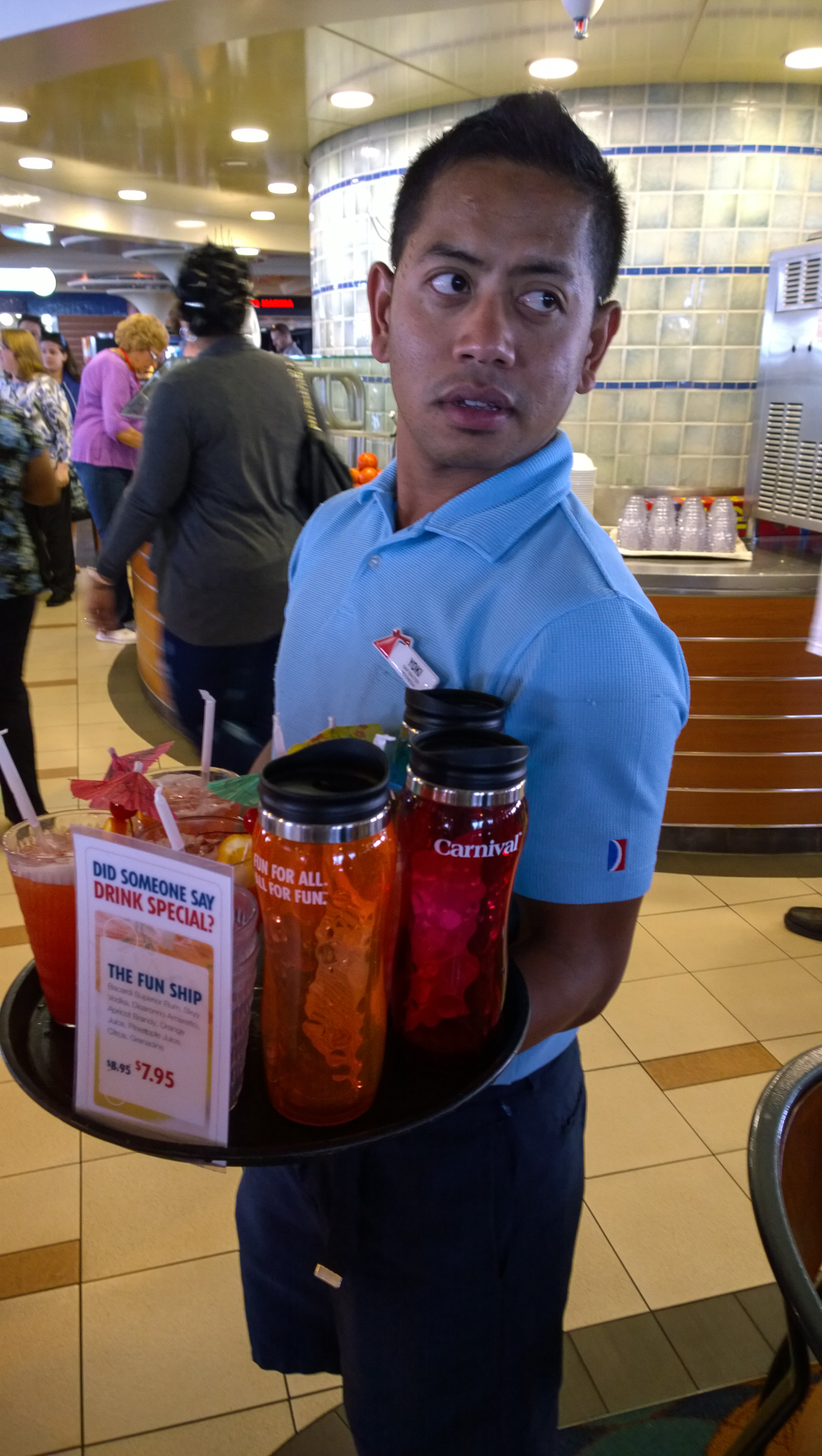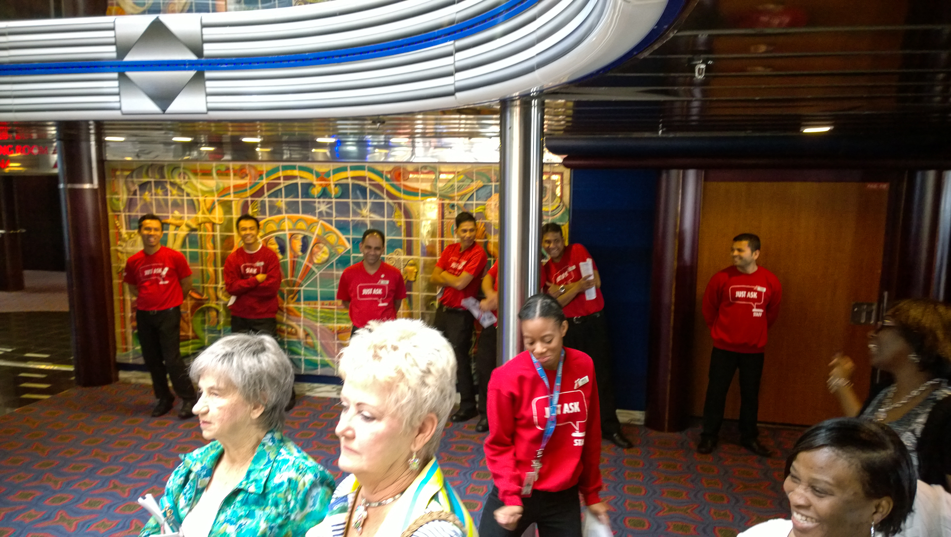 Another tip: As you board the ship, you’ll notice a bunch of crew wearing red sweatshirts that say “Just Ask”. If you need to know anything, like where you can grab some food or where you’re room is, they are there to answer those questions. No need to get in line for guest services!