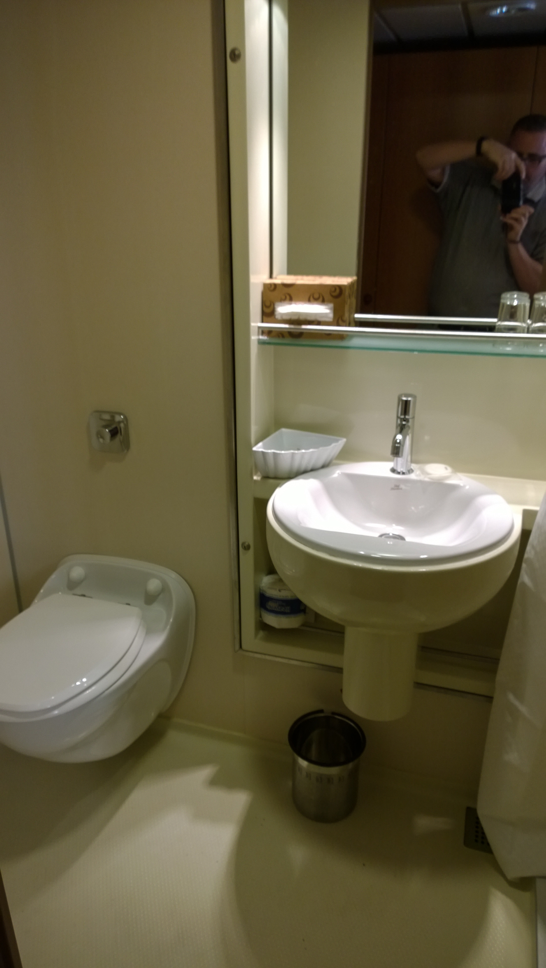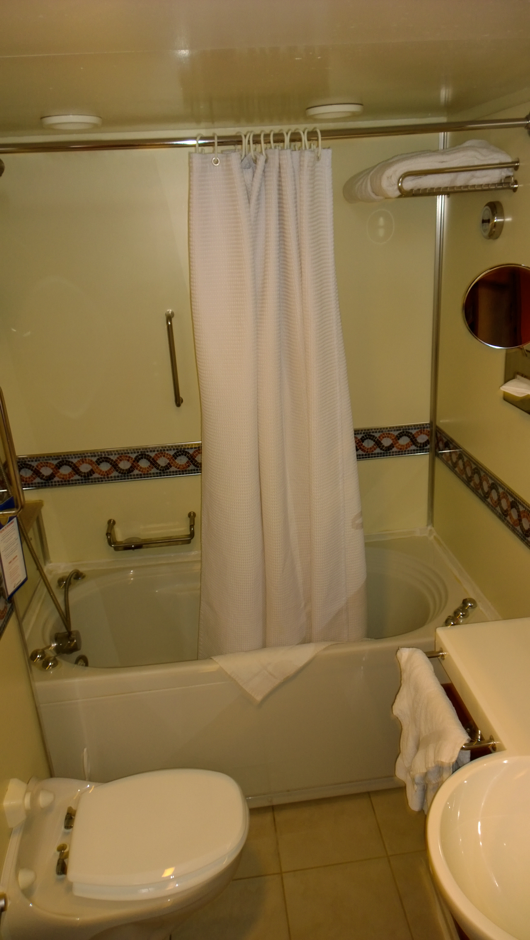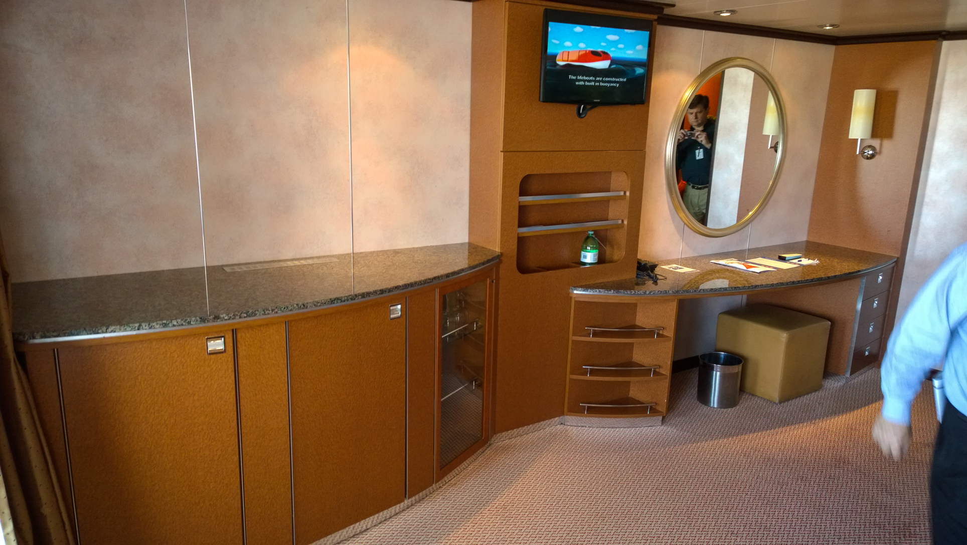Once we were on, we hustled to check out a couple of rooms. Since we were late, we really were moving fast, and my pictures show it. With more than two dozen people in the group and a schedule to keep, there really wasn’t time to stop and ensure the pictures were clear. The first set here is from a standard oceanview room: