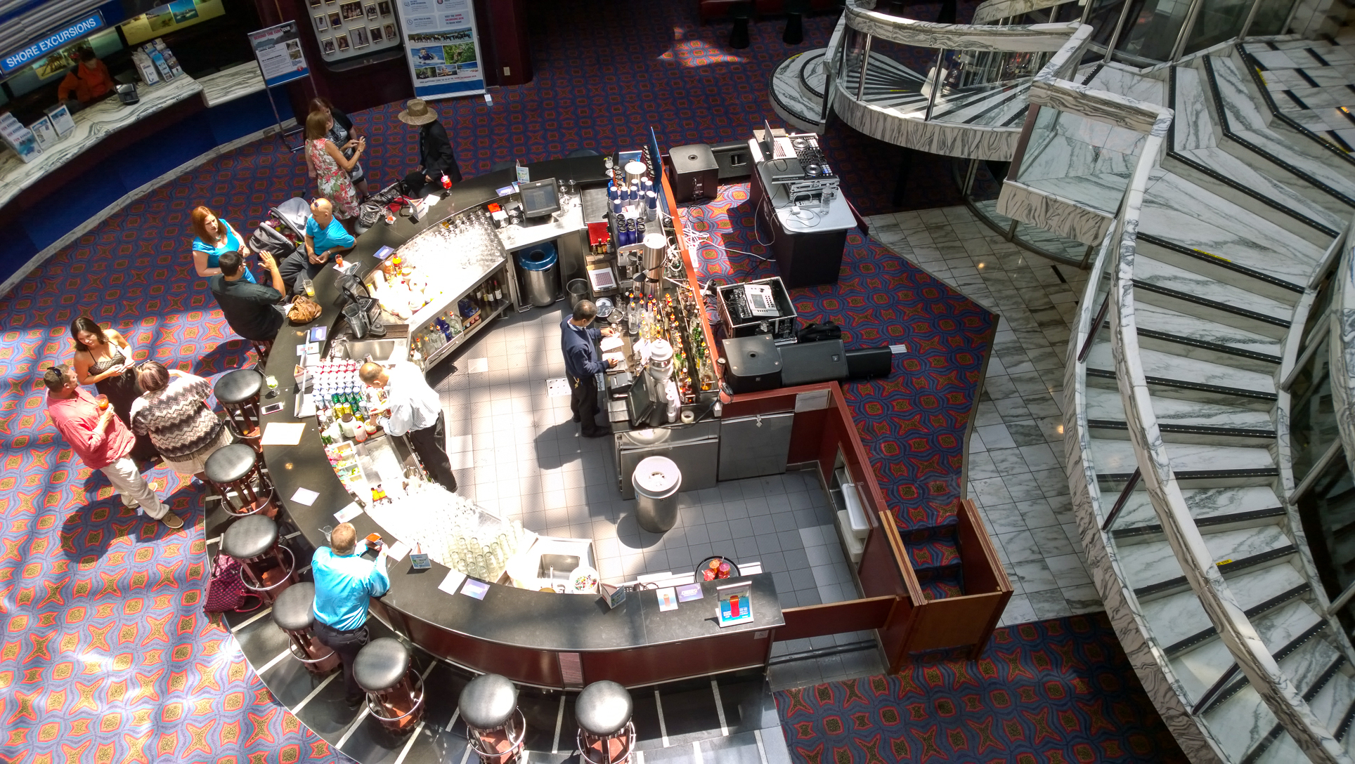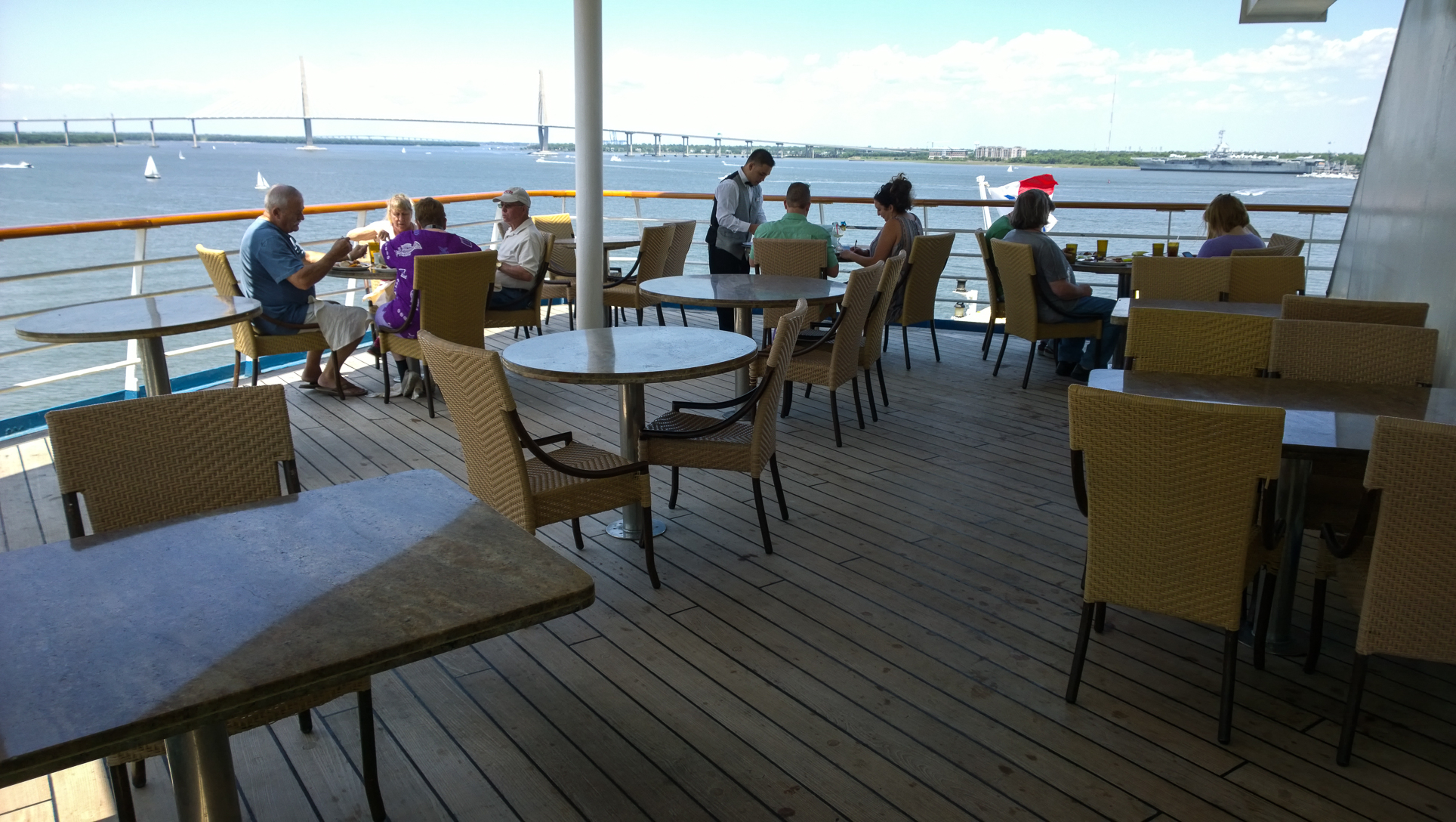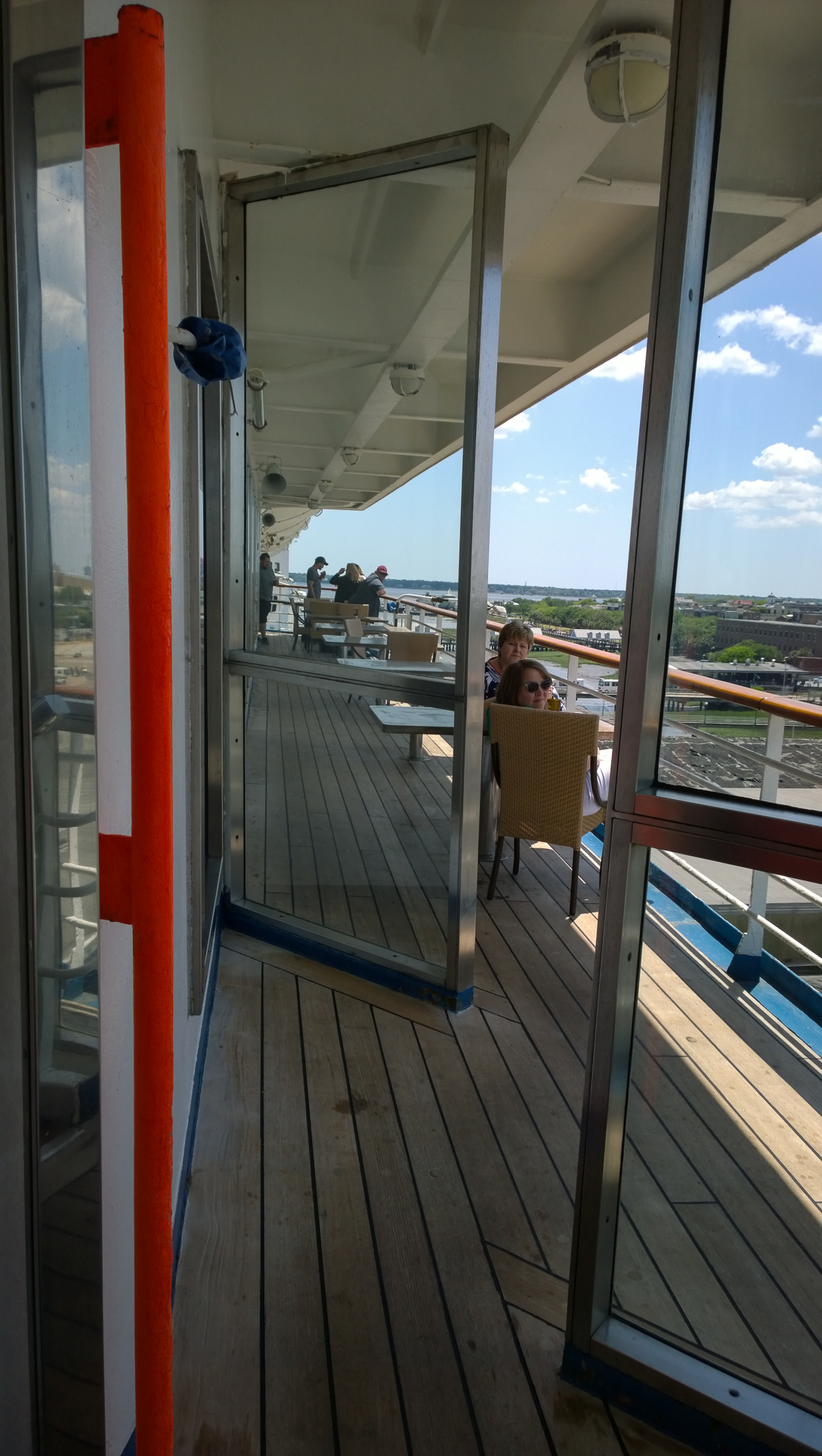 There were a couple of weddings going on today before sailing, from what we saw. We entered the port at the same place they did, and the wedding parties were shuttled in to security the same way we were. While I’m familiar with how on-board weddings at sea (or in a foreign port) work, this was my first exposure to weddings that take place in port prior to the ship’s departure. Not everyone in the wedding party was going on the cruise, so after getting everyone on the ship, they hold the wedding, followed by the reception, and then those who are not sailing are escorted off. Pretty good way to get a shipboard wedding on a budget.