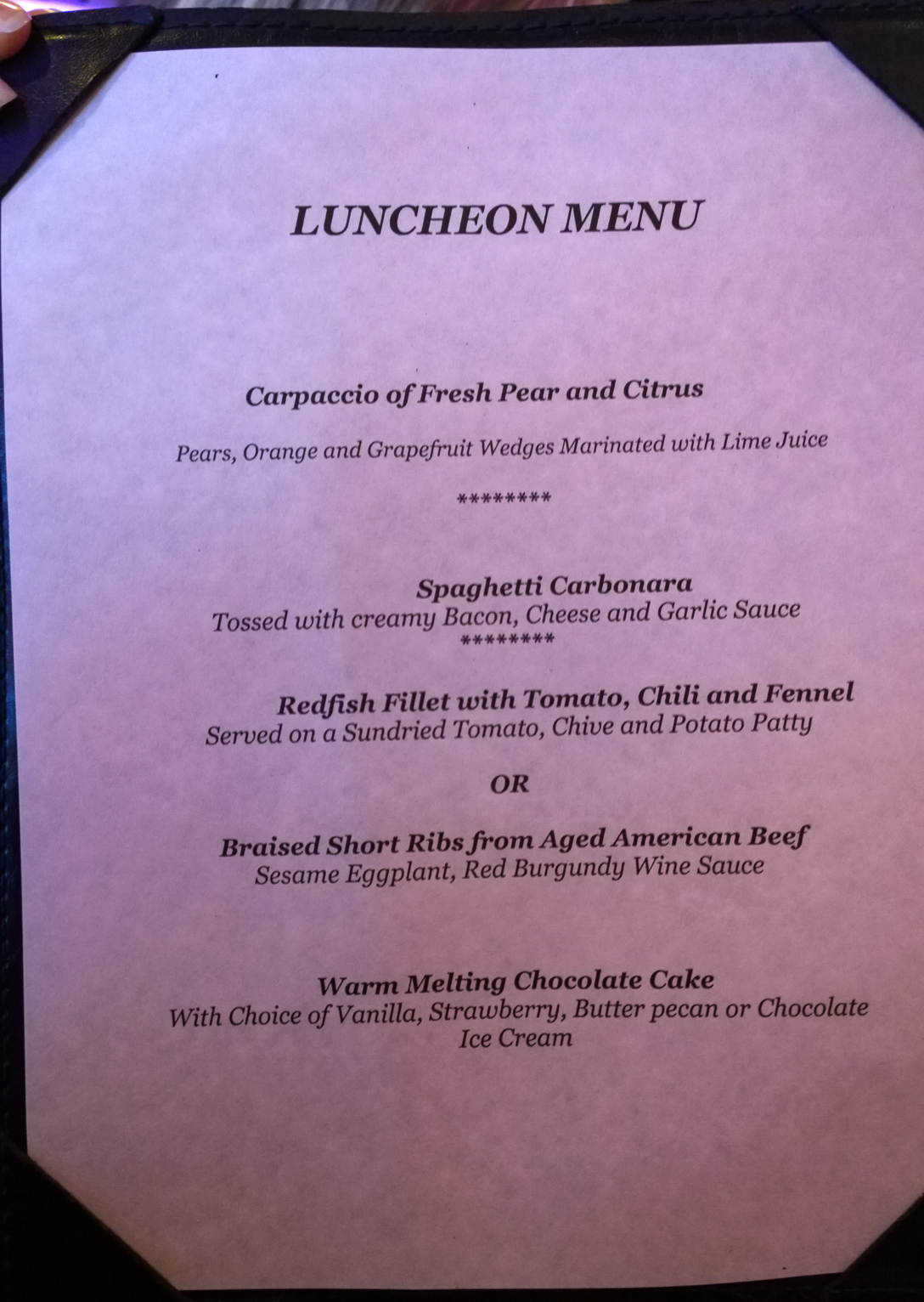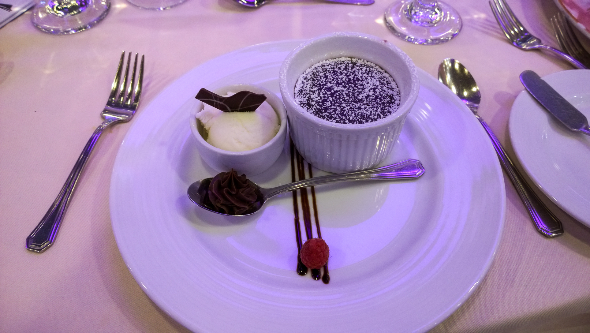 The spaghetti carbonara was spectacular, as was the warm chocolate melting cake, which is one of our all-time favorite desserts (we usually eat it more than once when we’re on Carnival :)). The braised short ribs were good quality meat, and perfectly cooked, but I’m just not a fan of what ends up being stringy meat (like pot roast type meat). Jen had the beef too, and enjoyed it, but said both the spaghetti and short ribs were better on her tour of the Splendor a couple of weeks ago (they serve the same food on all ship tours).