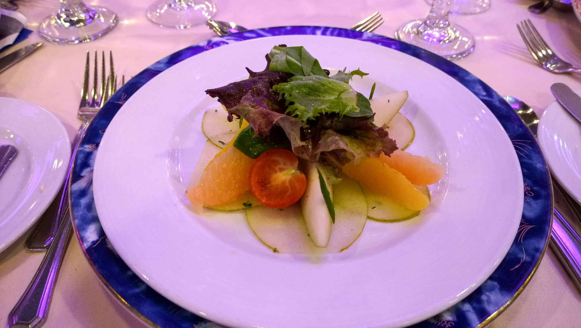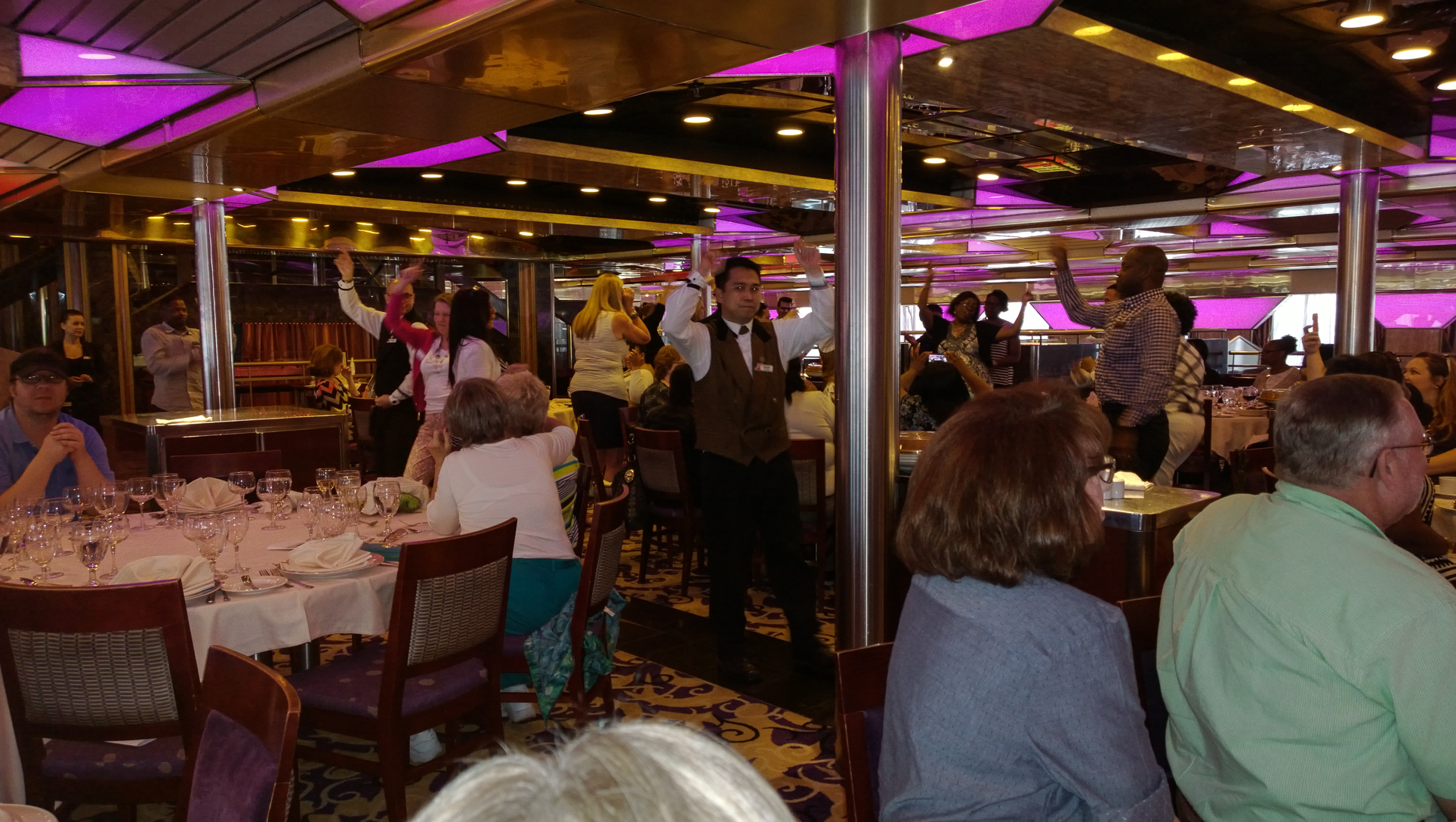 Let’s get back to the tour. After a quick visit to the kid’s club, it was time to eat. They took us to the Jubilee dining room at the aft of the Atlantic deck (8), one of the two main dining rooms on board. We all sat at one of the five tables set up for us, and were served by the staff as if we were cruisers, eating some of the same things served at sea. The menu was pretty well set too, with the only choice we got to make being fish or beef for the main course: