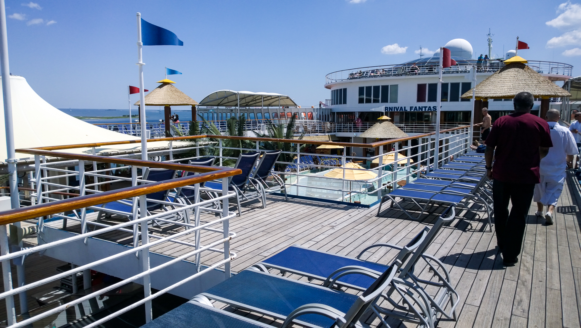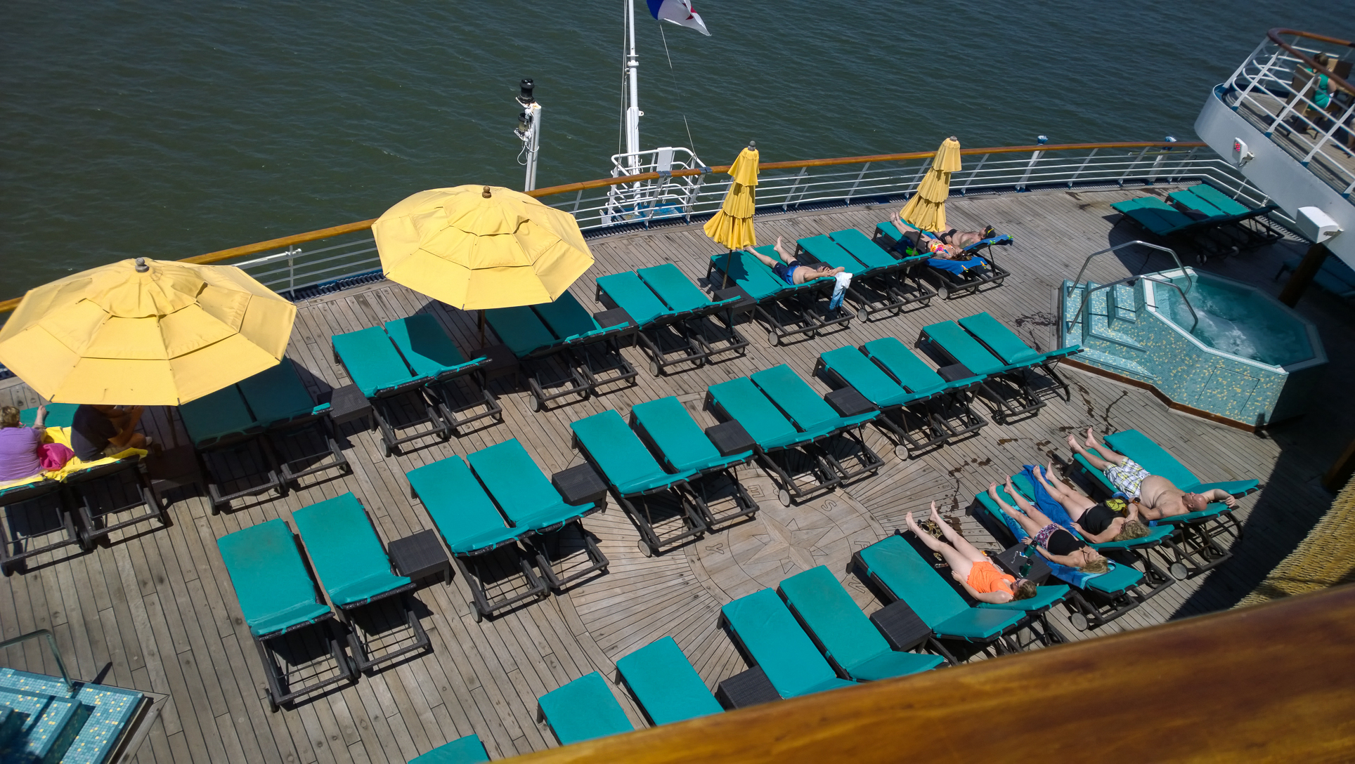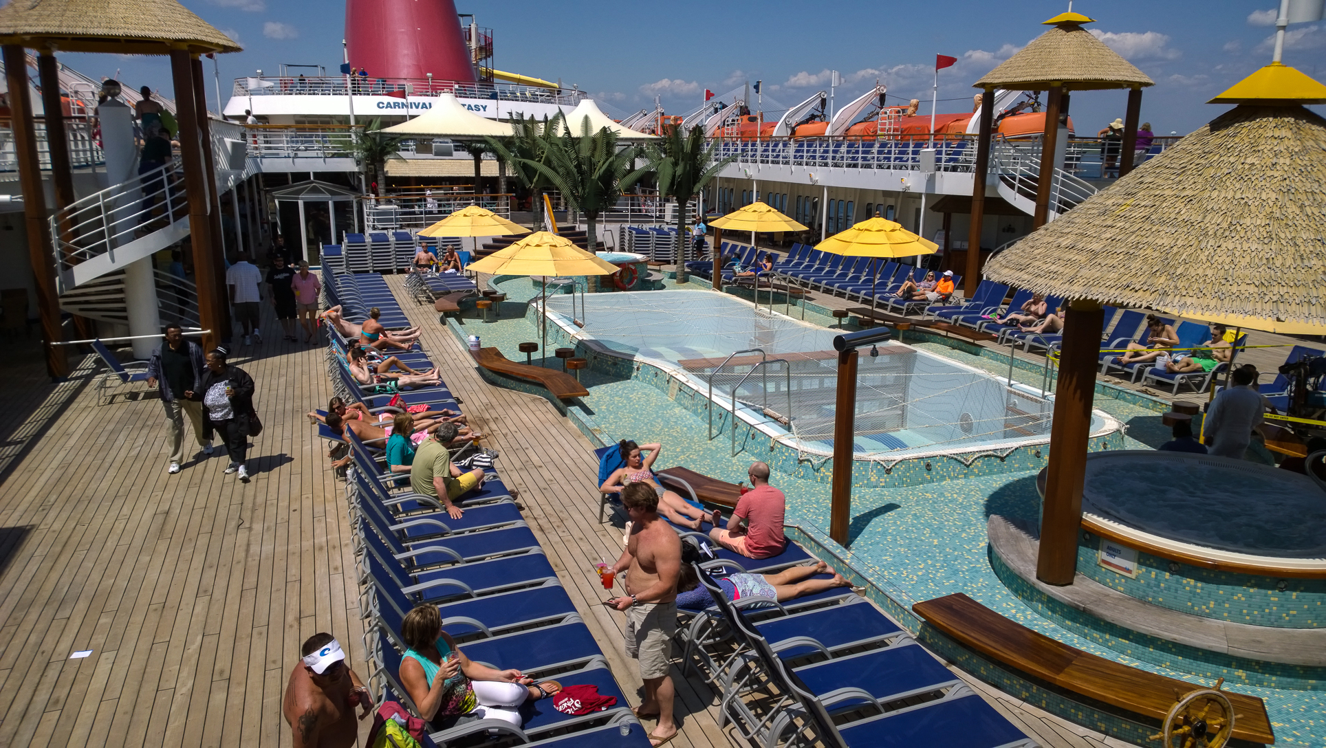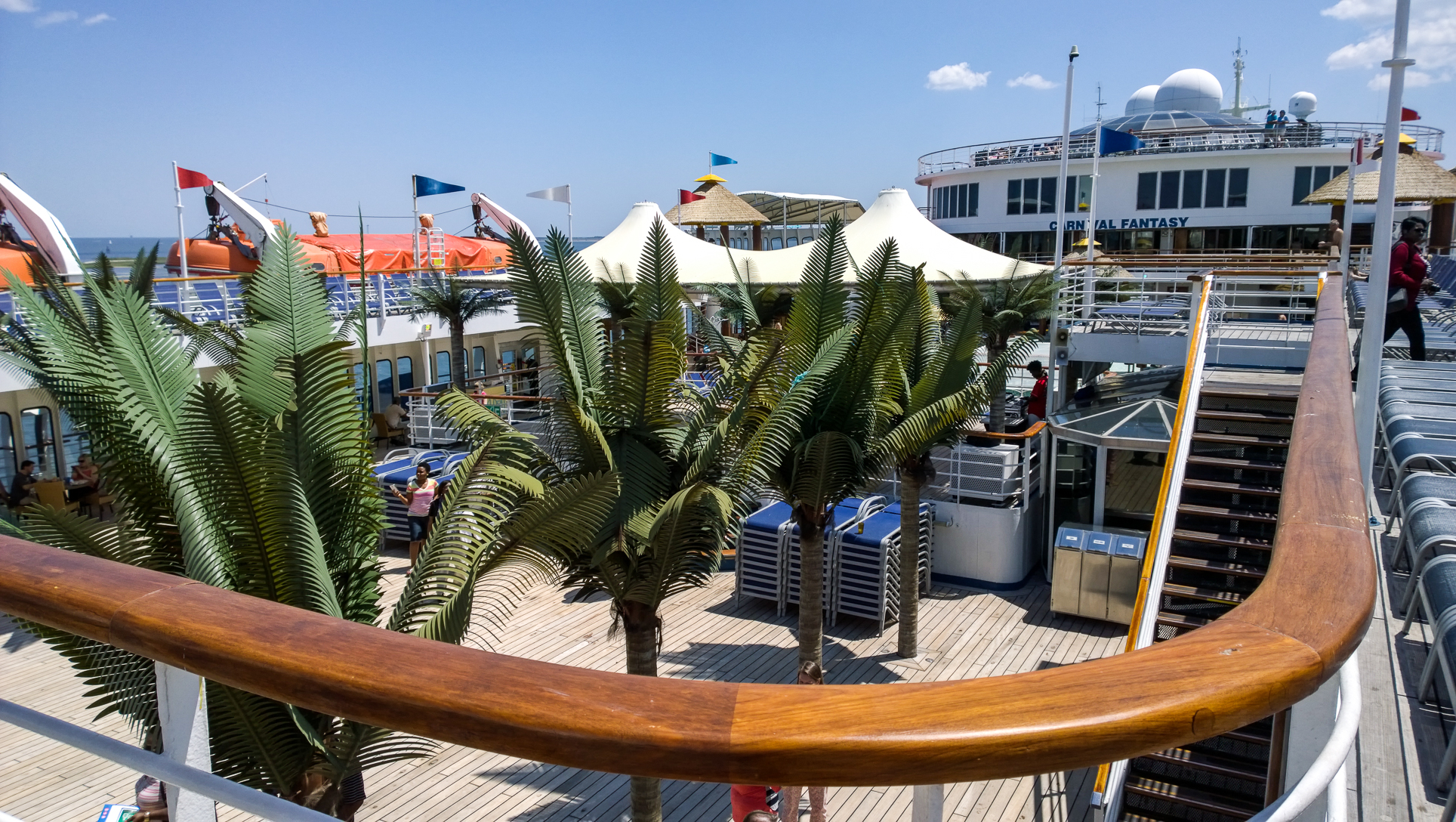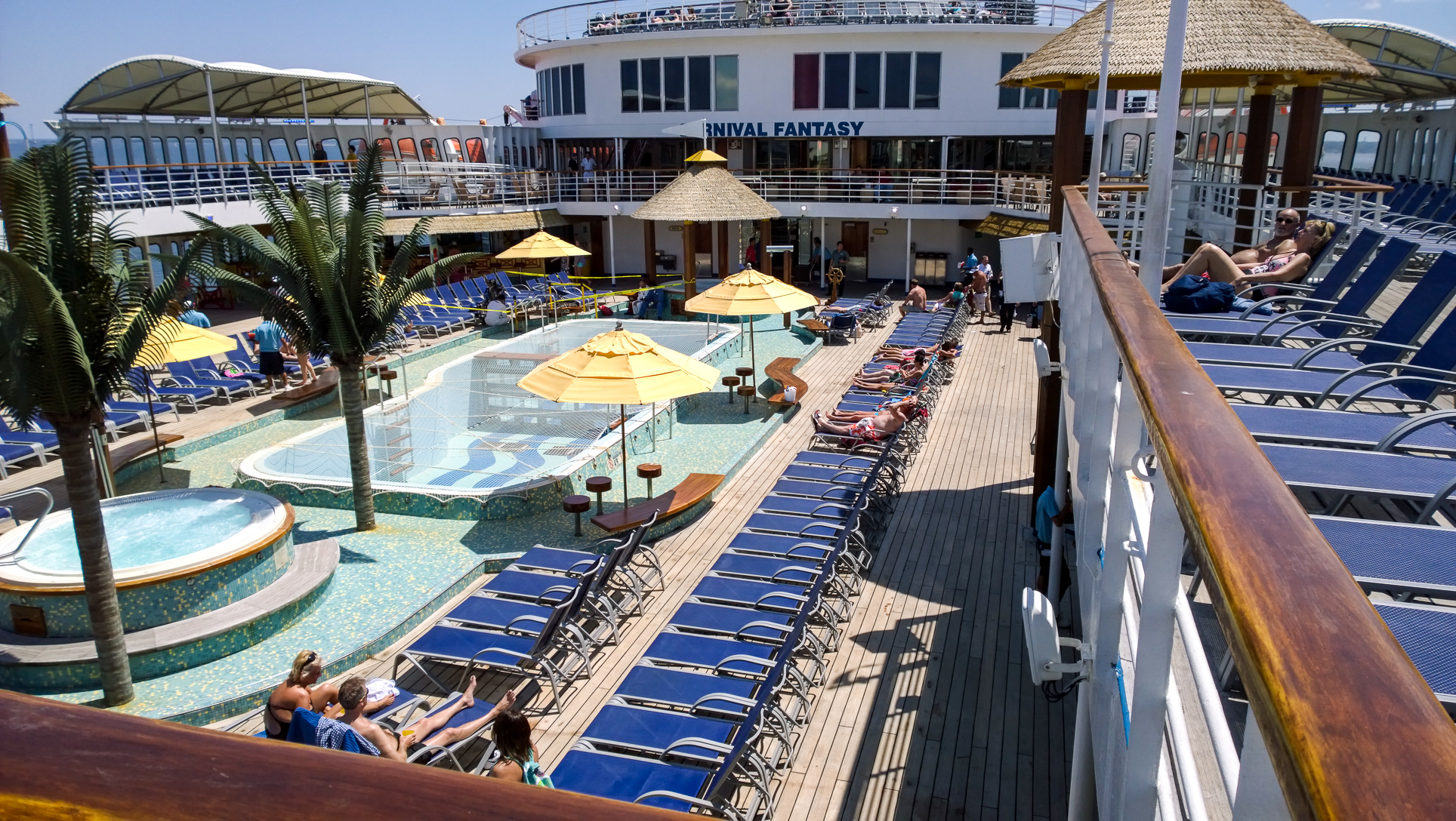 They’re definitely some nice slides for a ship this old, but the one downside here is location. Being right behind the stack, it was a bit noisier, especially as you walked out to this area (walkway shown in the first shot above). It is what is is, though. The other odd thing about the aft design is that one deck down is the Serenity adults-only area. I shot this looking down on it from the back of the ship where the waterslides are: