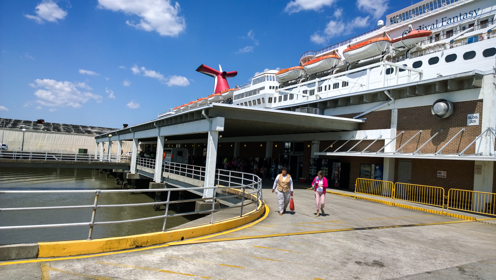We drove down from Charlotte early this morning, getting to the port around 10am. Check in for the tour wasn’t scheduled to begin until 11am after all the guests from the previous sailing debarked, so we walked around trying to figure out where to meet. Fortunately, the port area isn’t all that big and we found the spot pretty quickly, and hung out until the Carnival reps arrived. Things didn’t exactly kick off on time, as there was a lot going on. They ended up with surprise Coast Guard and USDA inspections happening after the ship got back in to port this morning. No biggie, things happen, and we were just a small blip on the list of things the crew had to deal with before they left port this evening. I think we may have been delayed 30-45 minutes boarding as a result. Here’s a couple quick shots of the port, including the front of the terminal. When you arrive and park, a shuttle brings you to this entrance and drops you off here, at which point you’ll go through security and check in for your cruise!