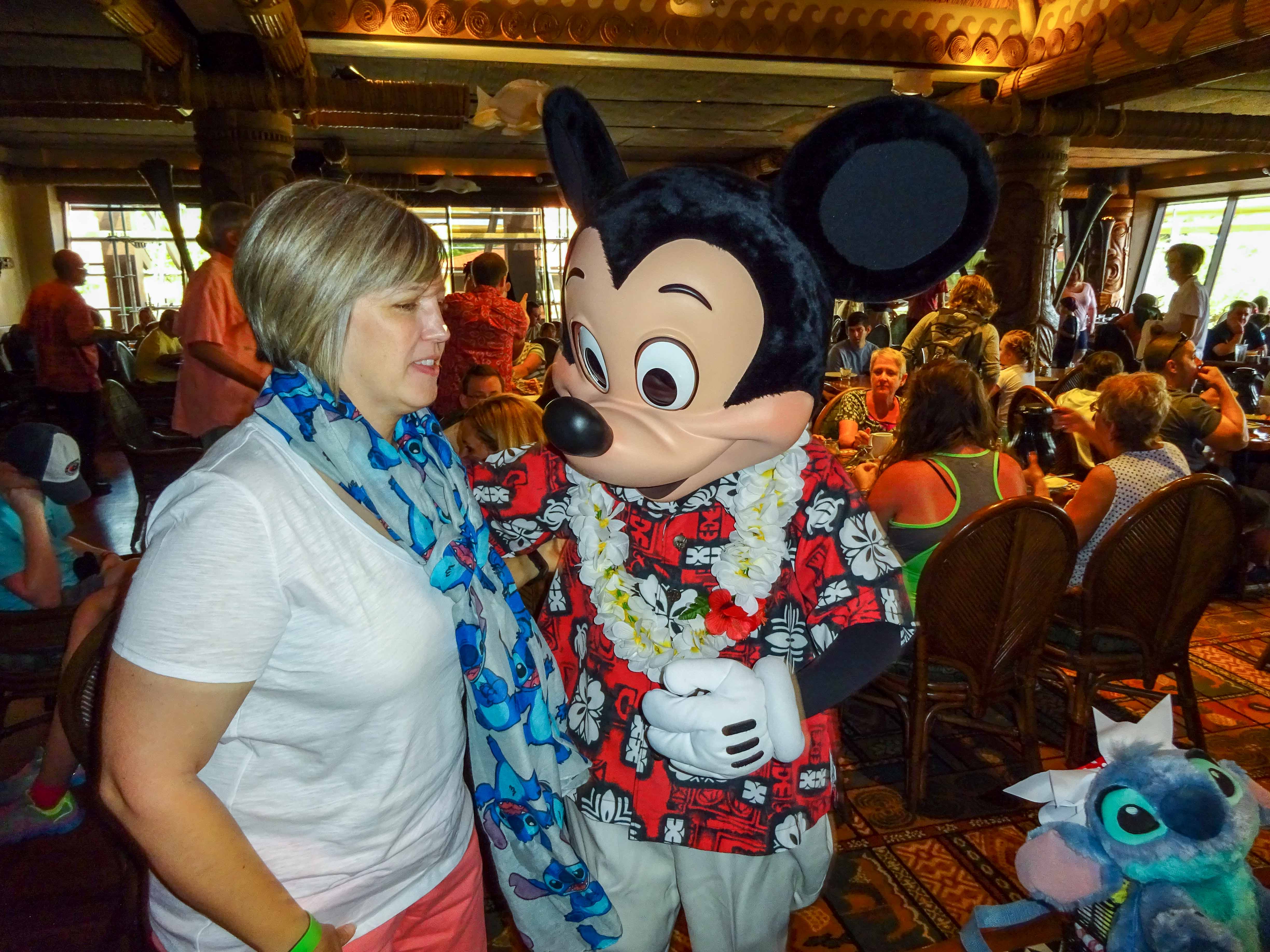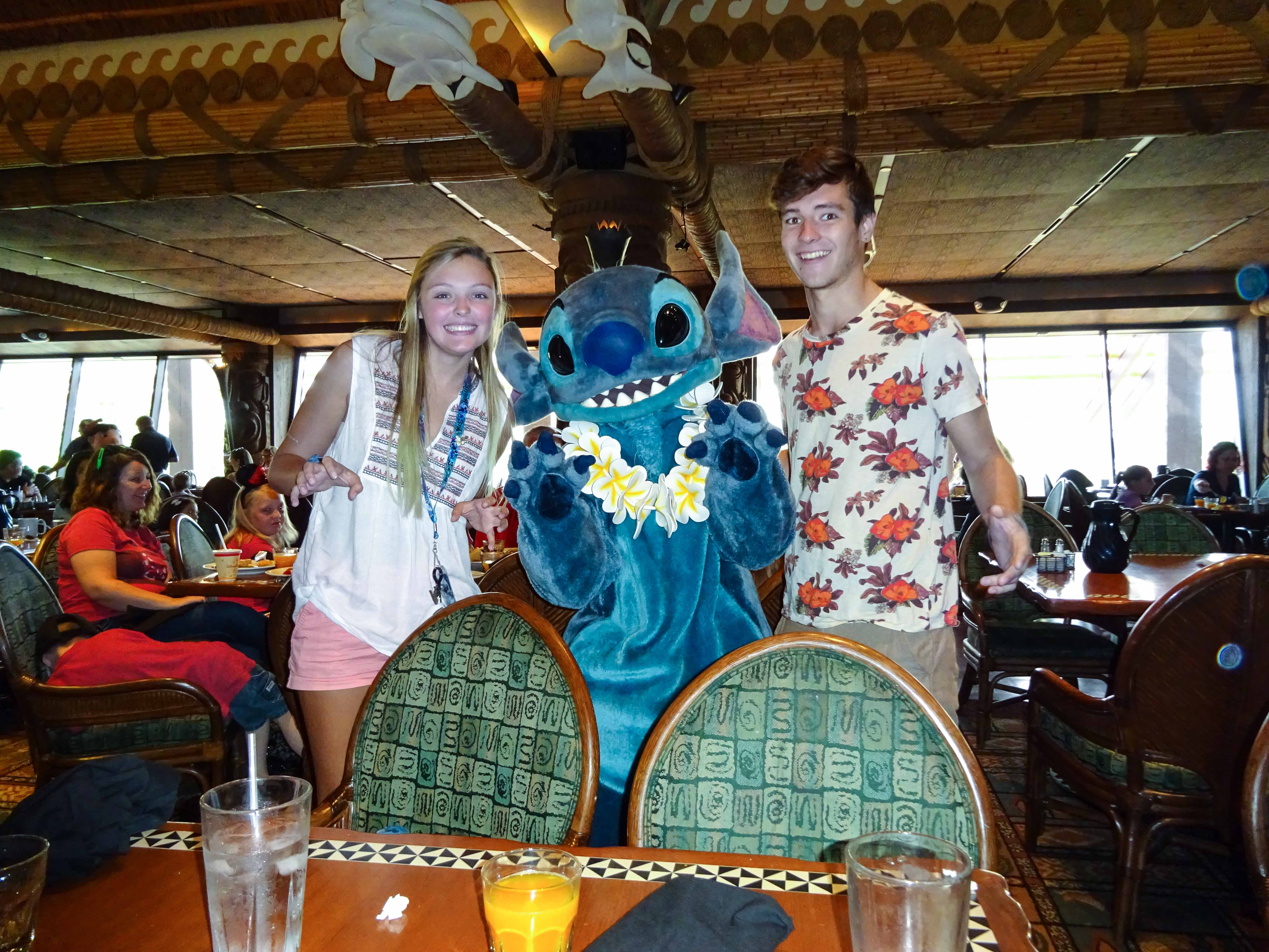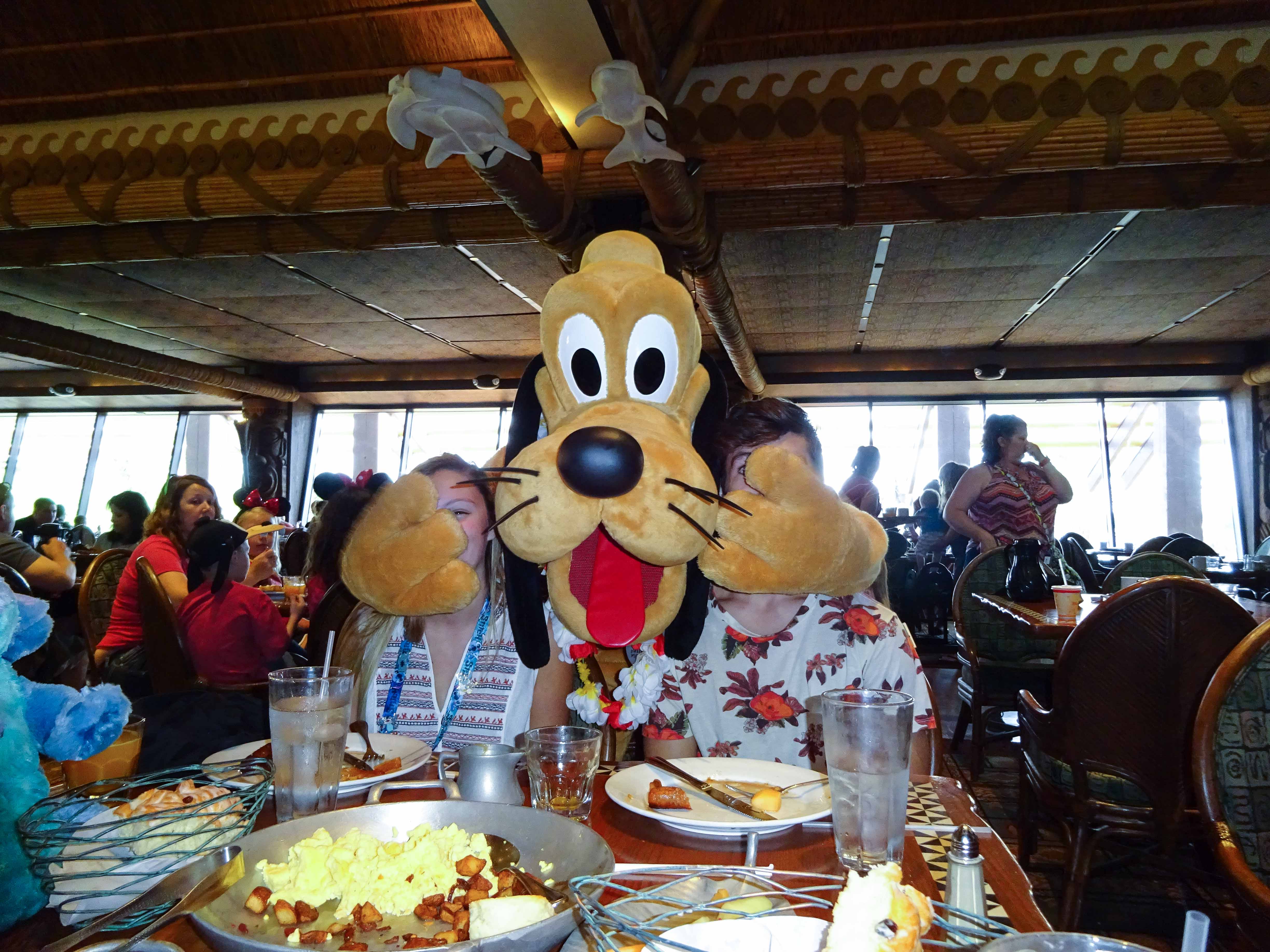 The food itself is pretty standard breakfast fare. Your servers bring plates of scrambled eggs, bacon and sausage, Mickey and Stitch waffles, breads, and a few other things. They’ll bring out more of any of the items, too. Like I said, pretty standard, and nothing special from a taste perspective. Like the other character meals, it’s not about the food, it’s about the characters. Mickey, Pluto, Lilo and Stitch make their way around the restaurant on a well choreographed schedule as you eat, and we had no problem getting time with any of them, even with a packed restaurant and a break for them to lead a parade of kids around the restaurant. One by one, each of the four characters stopped by for some pictures at various points during our meal: