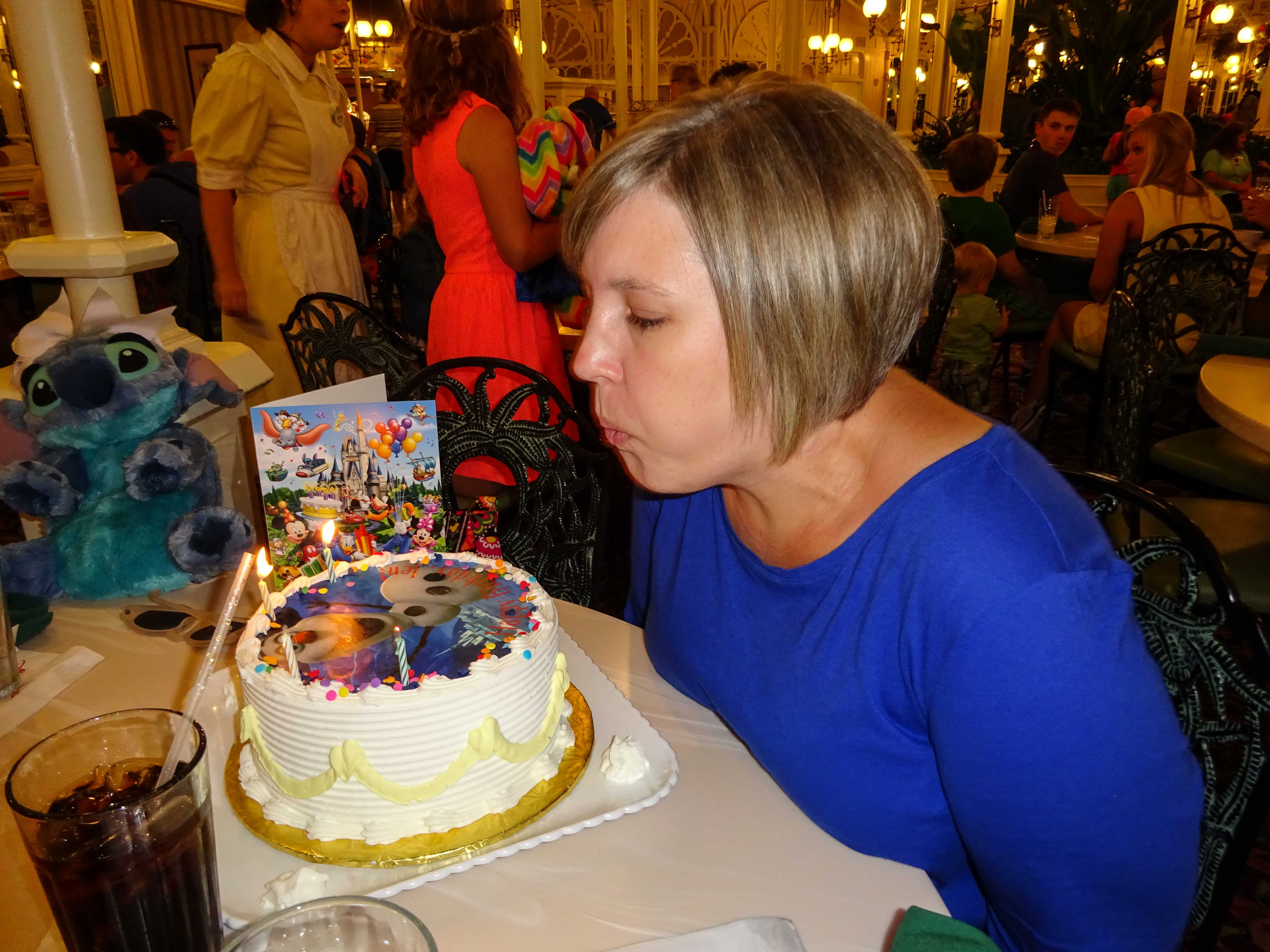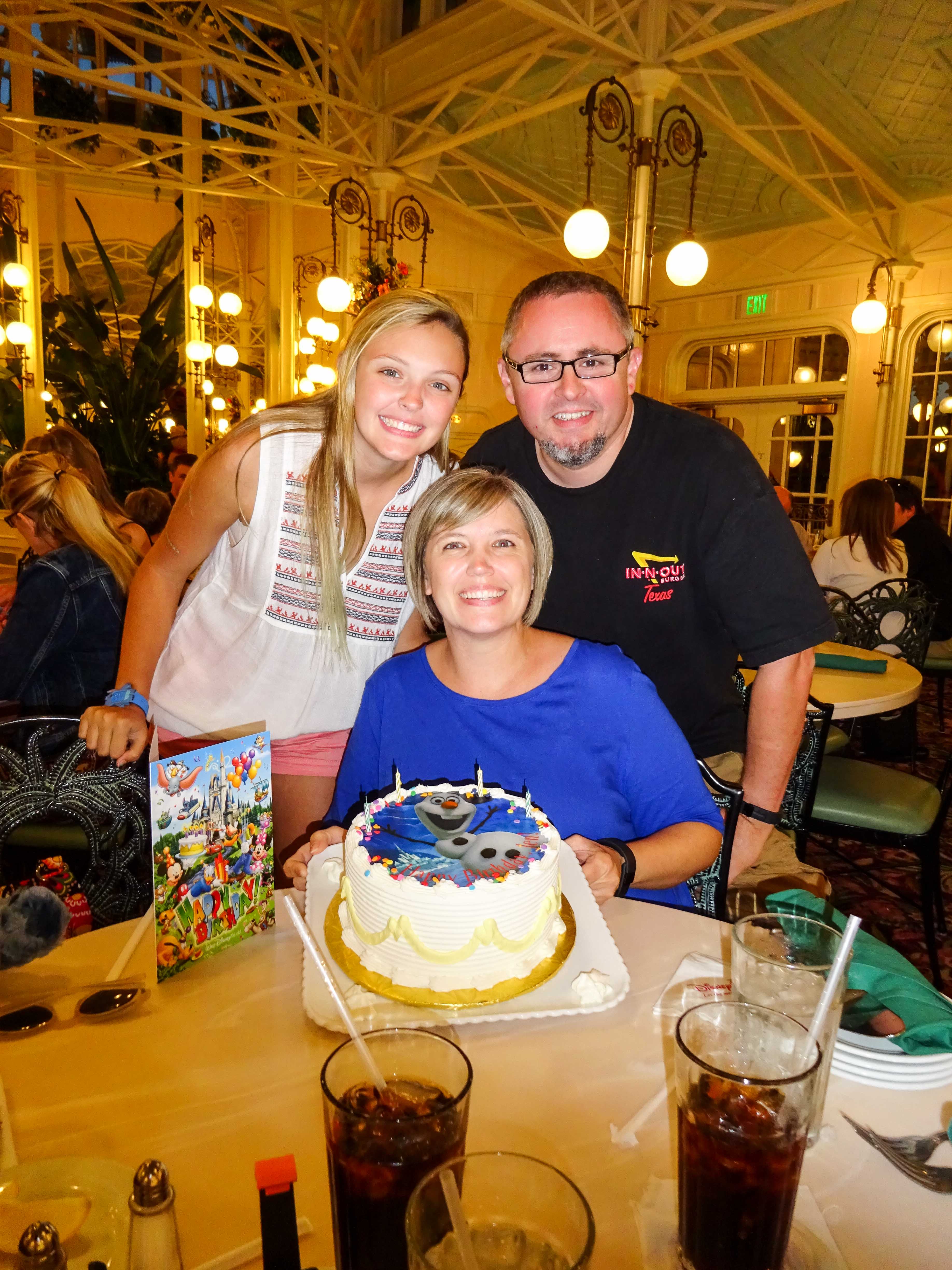 This restaurant is buffet service, and actually had some pretty good food. The mac and cheese in the kid’s section was pretty good, as were the mashed potatoes and the beef available on the carving station. Going against the diet Jen and I had been on in the weeks leading up to this trip, we both made two (or three in my case) trips up for more food. As we ate, the same well choreographed character visits we’d seen at Ohana were taking place here. Bayley had her selfie-stick with her, so she had fun taking selfies of her and Joe with each of the characters, and we made sure that each knew it was Jen’s birthday so she got a little extra attention. The outstanding service and fun table-side visits from Winnie the Pooh and friends made for a fun birthday, but it wasn’t over just yet.