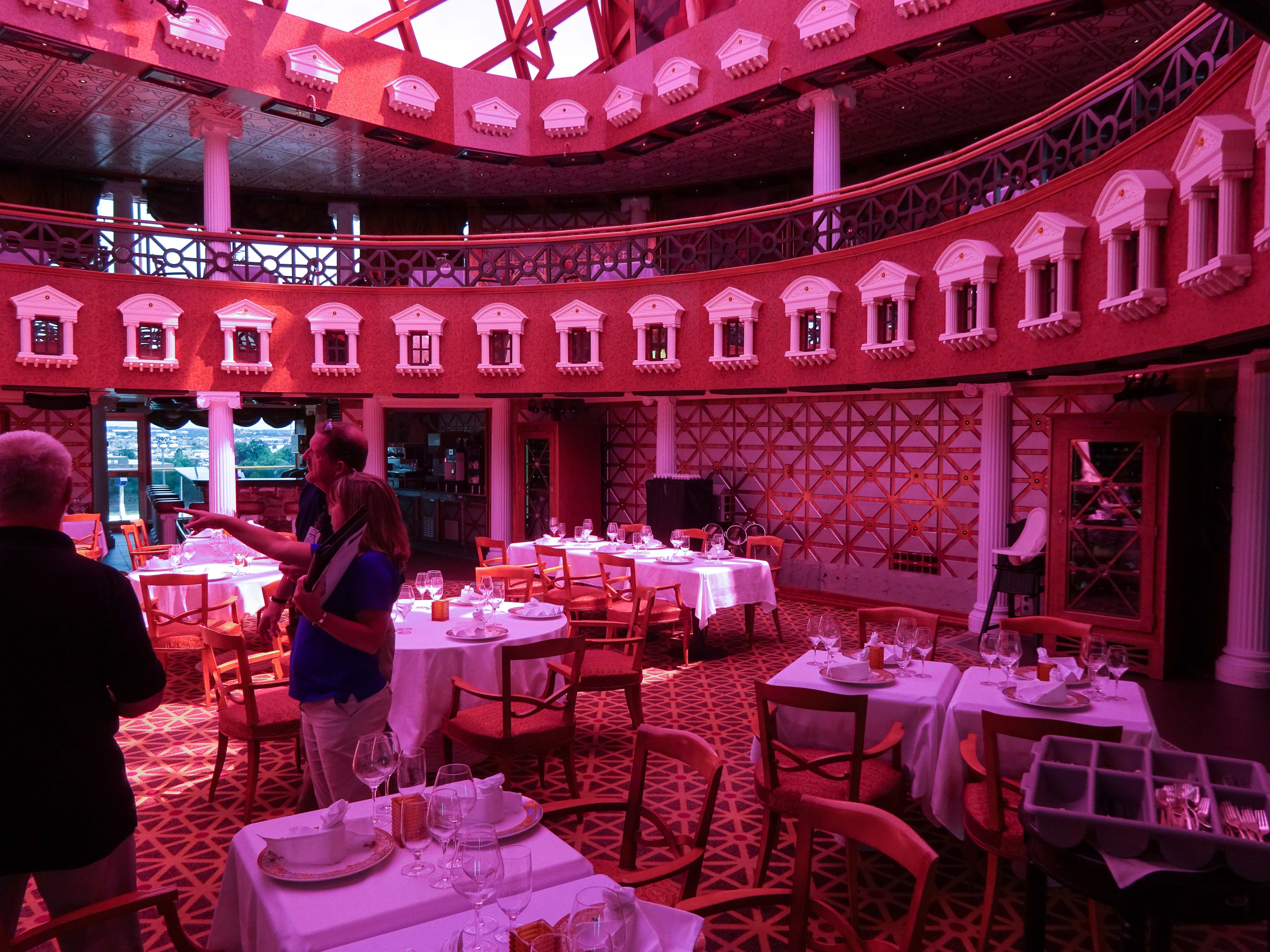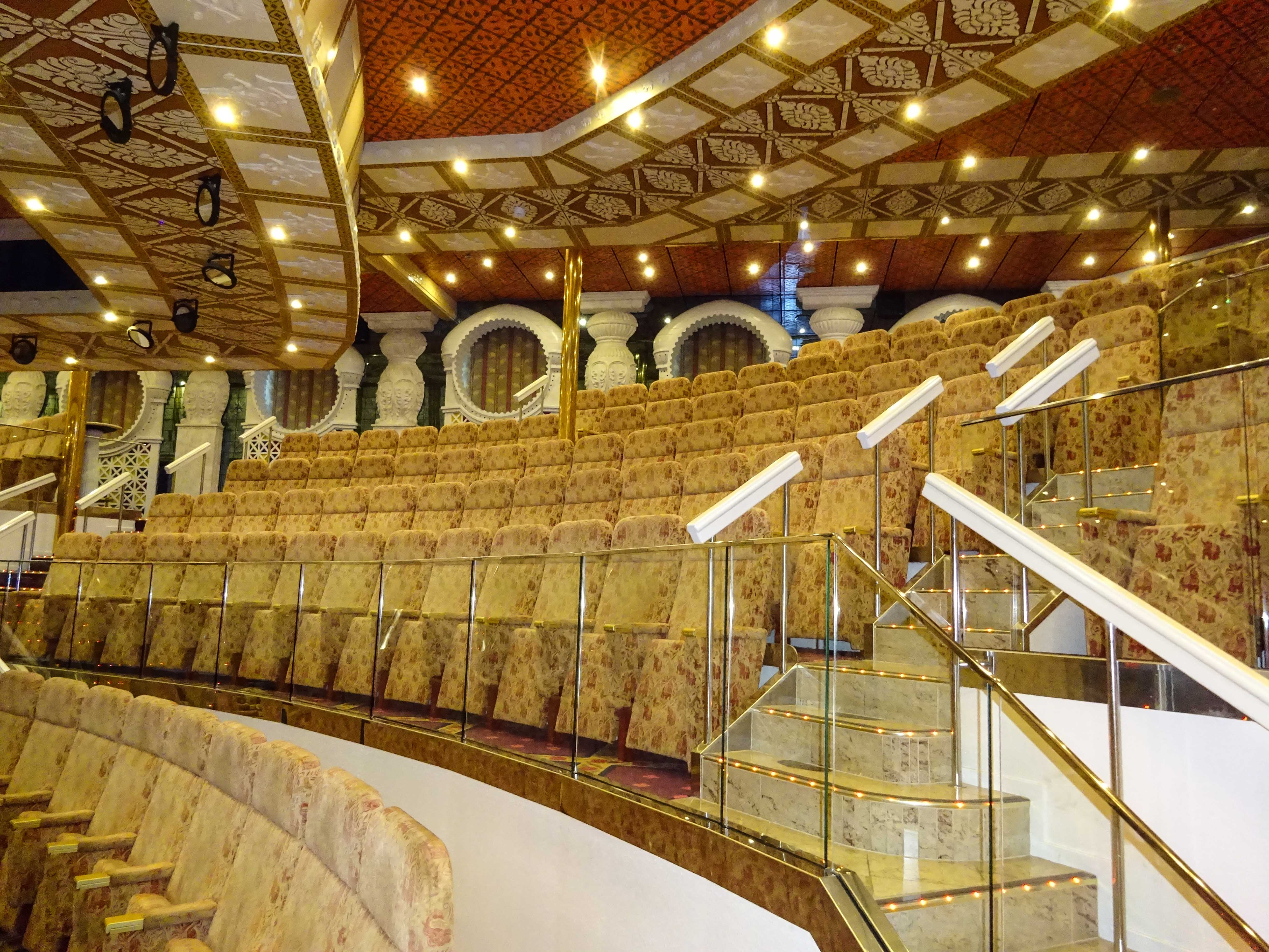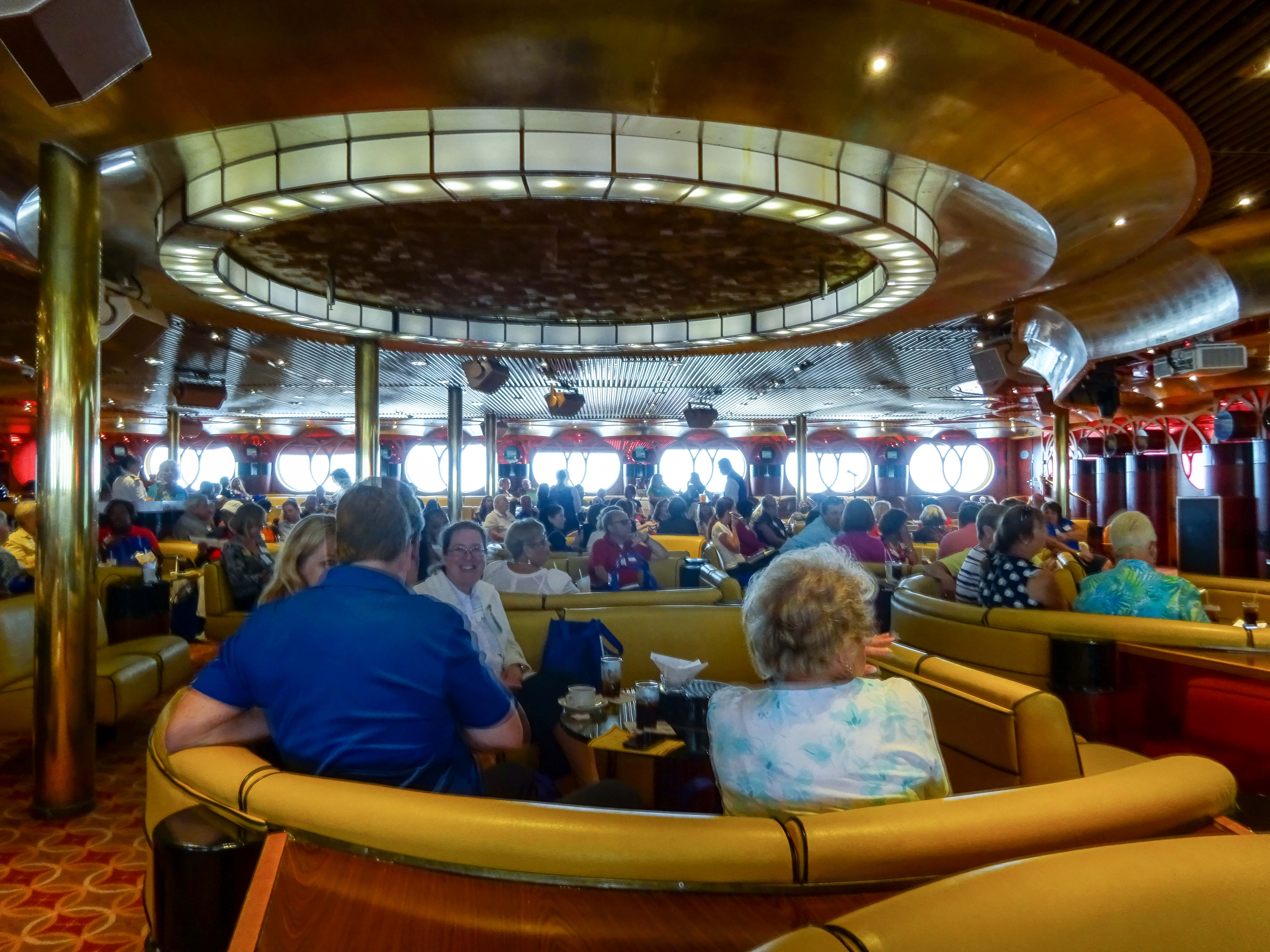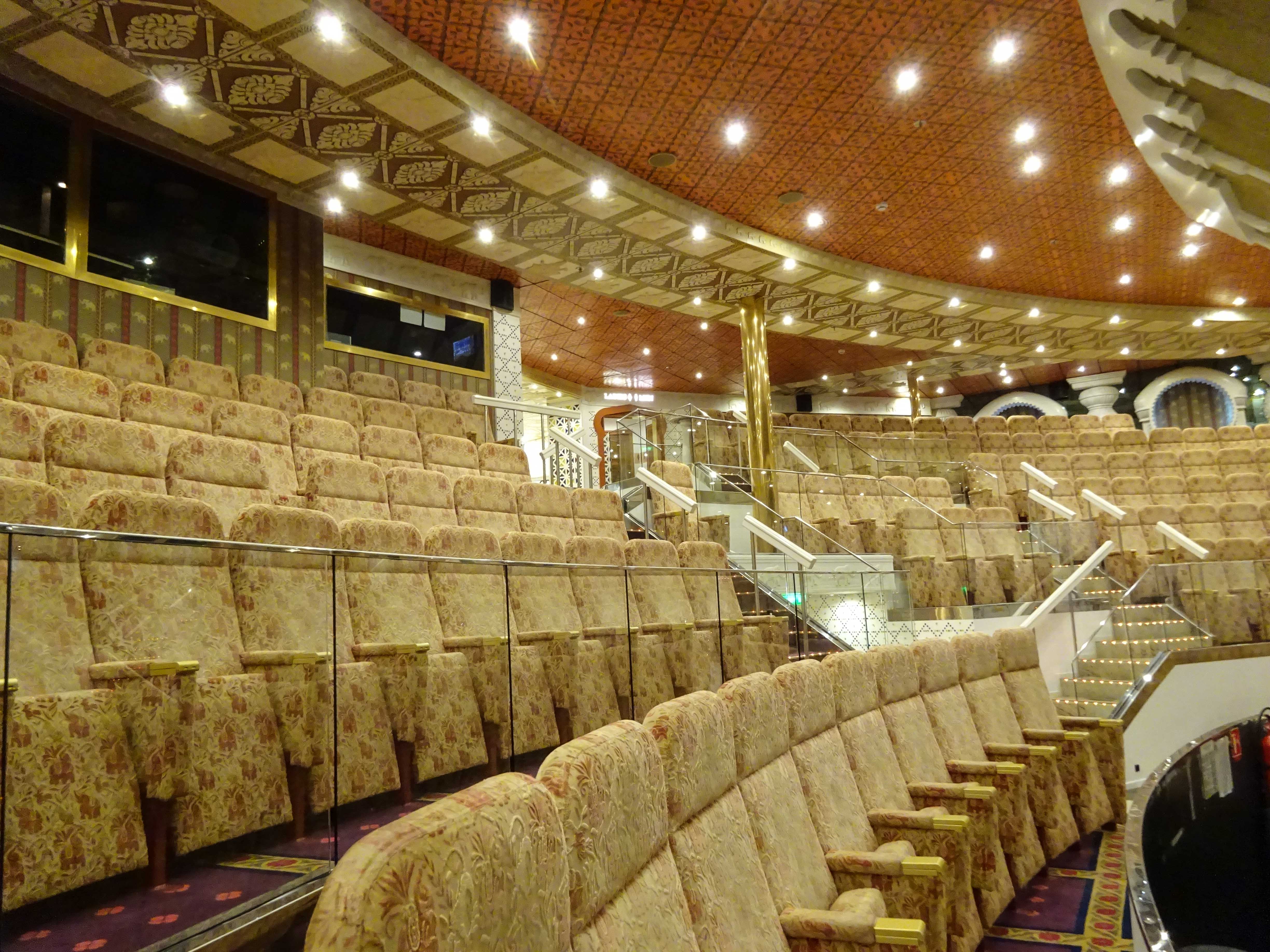 - The Ship: Yes, there is some bad here, too. Namely the main theater, which seems smaller than the Breeze. I assume Carnival was seeing a lot of empty seats in other ships in this class and as a result shrunk the theater, but the resulting design is just horrible. Really bad sight-lines throughout, rows in the back that sit lower than the row in front of them, and an odd center setup that’s totally flat (with non-permanent chairs) result in a place I really couldn’t stand to watch a show. The Divina showed us it is possible to build a large theater without things blocking your view, so what I saw in the Liquid Lounge was just mind boggling. Don’t even get me started on the useless cup tray permanently attached to every other armrest. Too slick to actually hold cups, yet totally uncomfortable for resting your arm on. Another ship design problem was the entrance to the Reflections dining room. Both sides are way too small, so the cattle-call queuing that happens prior to the MDR opening results in everyone standing even closer together. On the plus side, if you come in mid-ship, you can stare at the main DreamScape :).