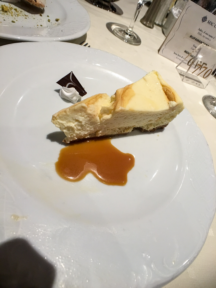 That took us in to dinner in the MDR, where we had a special 7 course Christmas eve meal. Things started off really slowly, as we only had the initial course before the first hour elapsed. They appeared to take notice of that, as things started coming out a lot faster, and all of the tables around us ended up losing out on one course, the pallet-cleansing sorbet set to arrive right before our entrees. While it would have been nice to have things a little more relaxed and in the proper order, we wanted to make it to the final bingo at 7:45, so we weren’t complaining. My dinner: