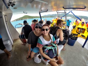 Just before noon, we headed back through port security to meet up with the excursion contact right outside of our ship. Just like last time, she escorted us to the end of the dock, where we hopped on the boat and headed out to Buck Island. One quick note here, there were only 13 of us on this trip (the three of us, and 10 from the Norwegian Spirit). Last month, the same boat had 49 people. The number of people wasn’t a problem at all last month, but having a smaller number was really cool, as we got twice the amount of time in the underwater scooters because of it. Apparently there were 34 people from the Carnival Valor that were supposed to be on the trip, but their ship was an hour or so late to port, and the BOSS folks couldn’t wait. Sorry guys, but we had fun without you :).